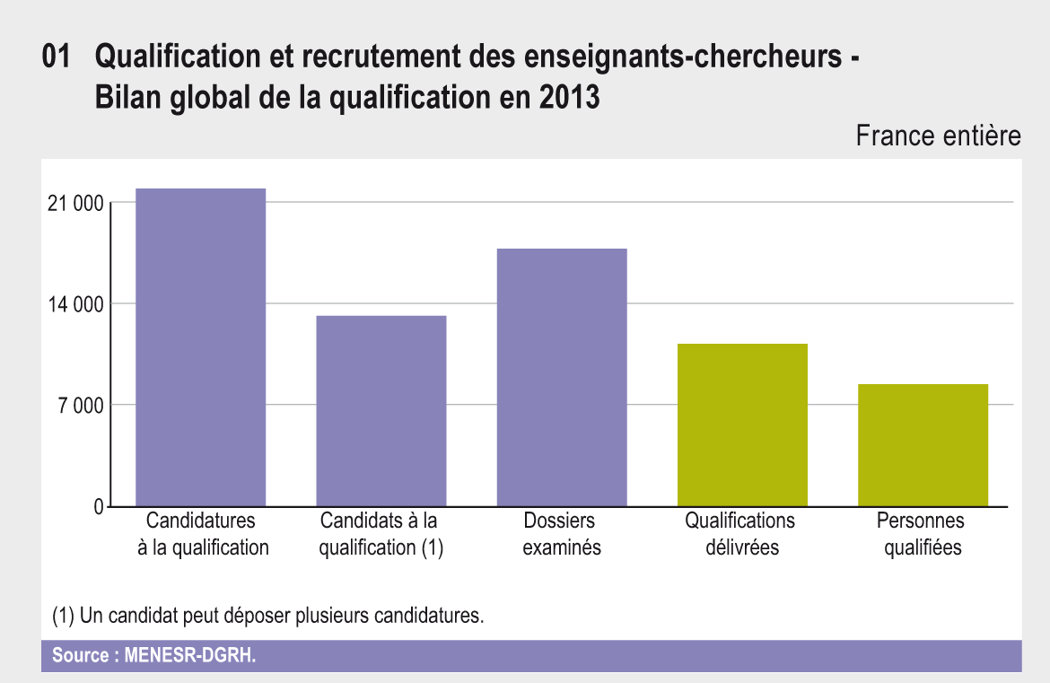 En 2015, 10 956 qualifications ont été délivrées à 8 243 qualifiés. 2 037 enseignants-chercheurs ont été recrutés dans les corps de professeurs des universités et de maîtres de conférences. Environ 44 % des maîtres de conférences recrutés sont des qualifiés de l’année et 46% pour les professeurs. La part des étrangers recrutés dans le corps des maîtres de conférences est stable à environ 15 %. L’endorecrutement représente 20 % chez les maîtres de conférences et 44 % chez les professeurs des universités [Consulter cette page]