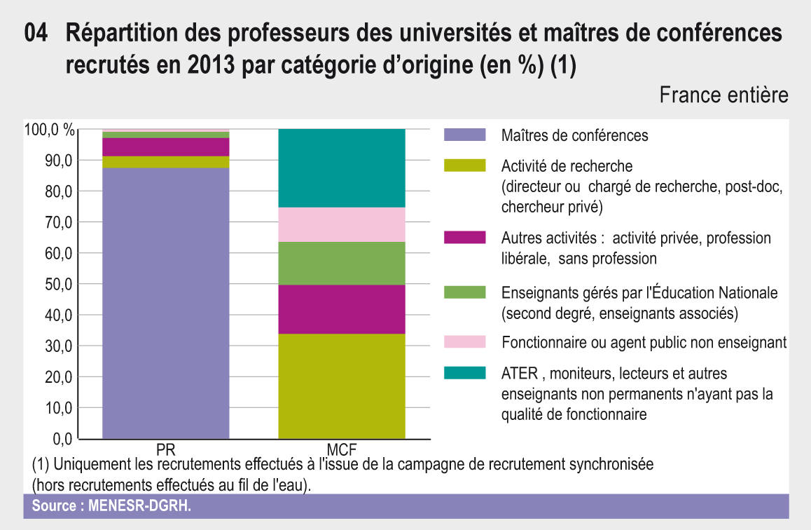 En 2013, 2 099 enseignants-chercheurs ont été recrutés dans les corps de professeurs des universités et de maîtres de conférences. Environ 44 % d’entre eux ont obtenu leur qualification lors de la campagne 2013, soit immédiatement avant ces opérations de recrutement. La part des enseignants chercheurs étrangers recrutés s’accroit régulièrement et atteint 17 % pour les maîtres de conférences. L’endo-recrutement représente 22 % chez les maîtres de conférences (MCF) et 55 % chez les professeurs des universités (PR).