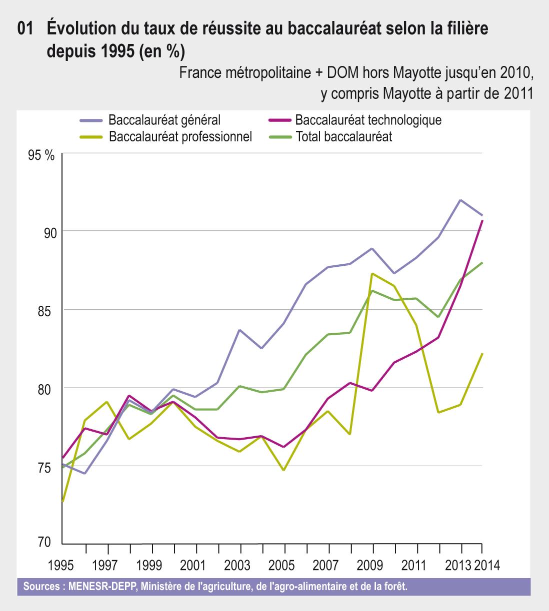 07.01 Évolution du taux de réussite au baccalauréat selon la filière depuis 1995 (en %)