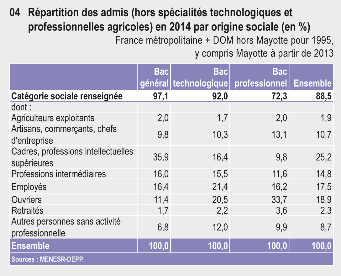 À la session 2011, le taux de réussite au baccalauréat atteint 85,7 %. Plus d’un bachelier généraliste sur trois est enfant de cadre ou profession intellectuelle supérieure. Au total en 2011, 71,6 % des jeunes d’une génération ont obtenu un baccalauréat. Pour la moitié d’entre eux, il s’agit d’un baccalauréat technologique ou professionnel [Consult the following page]