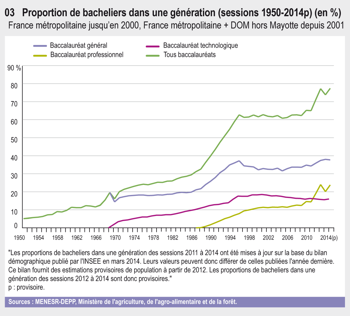 Proportion d’une génération titulaire du baccalauréat : Il s’agit de la proportion de bacheliers d’une génération fictive d’individus qui auraient, à chaque âge, les taux de candidature et de réussite observés l’année considérée. Ce nombre est obtenu en calculant, pour chaque âge, la part de lauréats dans la population totale de cet âge, et en faisant la somme de ces taux par âge. Les calculs ont été faits en utilisant les séries démographiques de l’Insee. La base en vigueur en mars 2014 permet de calculer des valeurs provisoires de proportion de bacheliers dans une génération pour les sessions 2012, 2013 et 2014. Les valeurs des sessions antérieures sont définitives.