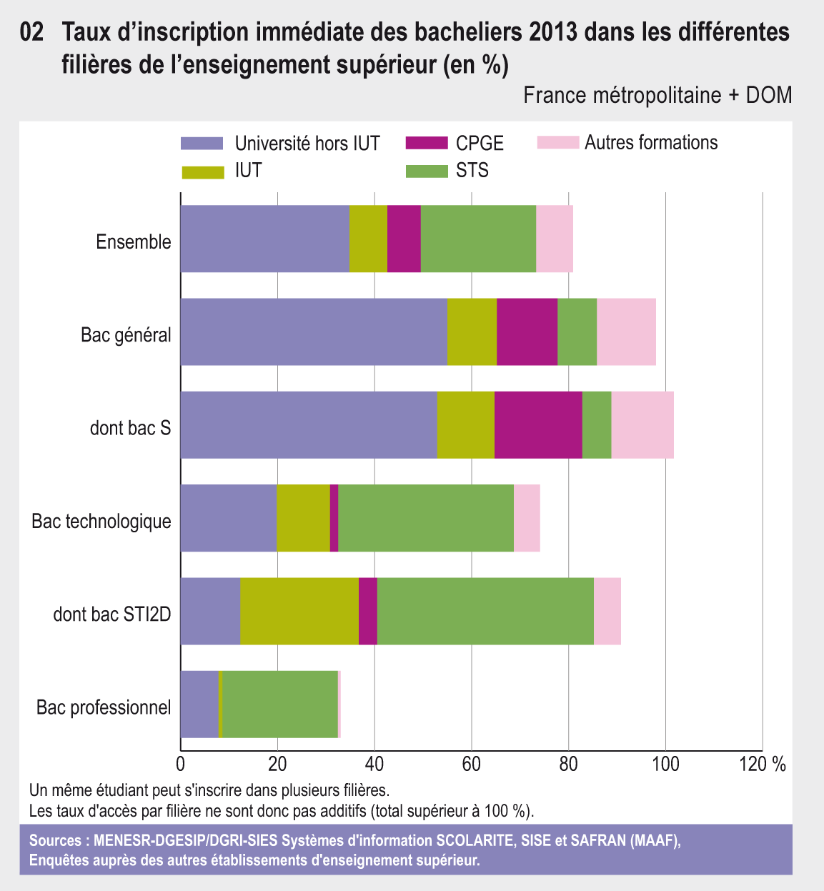 Environ 75 % des bacheliers 2013 s’inscrivent immédiatement dans l’enseignement supérieur (hors alternance). Plus de la moitié des bacheliers généraux s’inscrivent à l’université mais c’est près de 7 points de moins qu’en 2000. Près d’un bachelier technologique sur deux s’inscrit dans une filière professionnelle courte. Les bacheliers professionnels, dont les effectifs ont considérablement augmenté avec la réforme de la voie professionnelle, sont de plus en plus nombreux à s’inscrire dans l’enseignement supérieur.