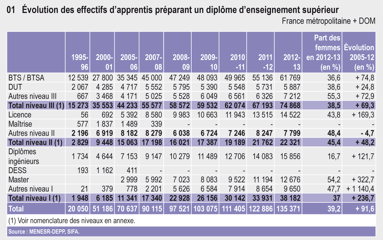 Entre les rentrées 1995 et 2000, le nombre d’apprentis de niveaux III (préparation d’un diplôme bac + 2), II et I (préparation d’un diplôme de 2e, 3e cycle ou grande école) passe de 20 050 à 51 200 (tableau 12.01). À partir de 2005, la croissance s’accélère avec l’apparition de la Licence professionnelle et du Master. Entre 2005 et 2012, le nombre d’apprentis dans le supérieur croît de 91,6 %. Cette croissance porte à elle seule la progression des effectifs totaux d’apprentis. En 2012-2013, près d’un apprenti sur trois suit une formation dans le supérieur. Le nombre d’apprentis dans le supérieur atteint 135 400 à la rentrée 2012 : cela correspond à 2,1 % des jeunes âgés de 18 à 25 ans. Le poids de l’apprentissage dans l’enseignement supérieur est de 5,5 %.