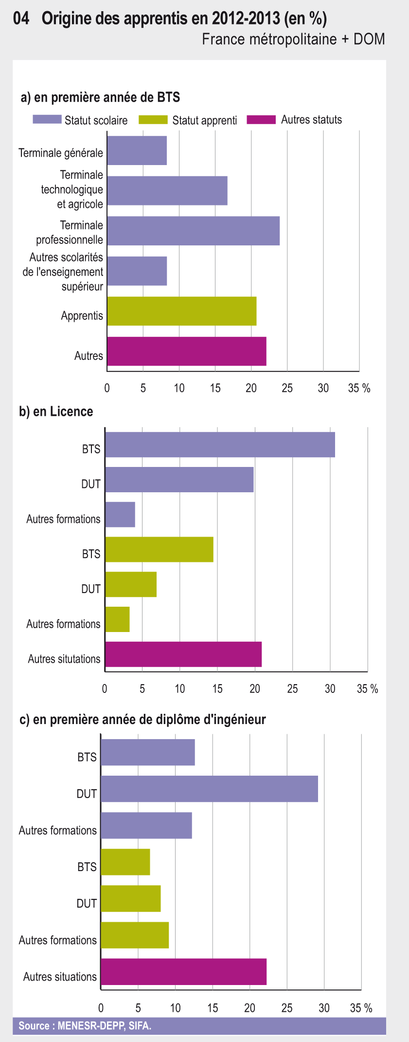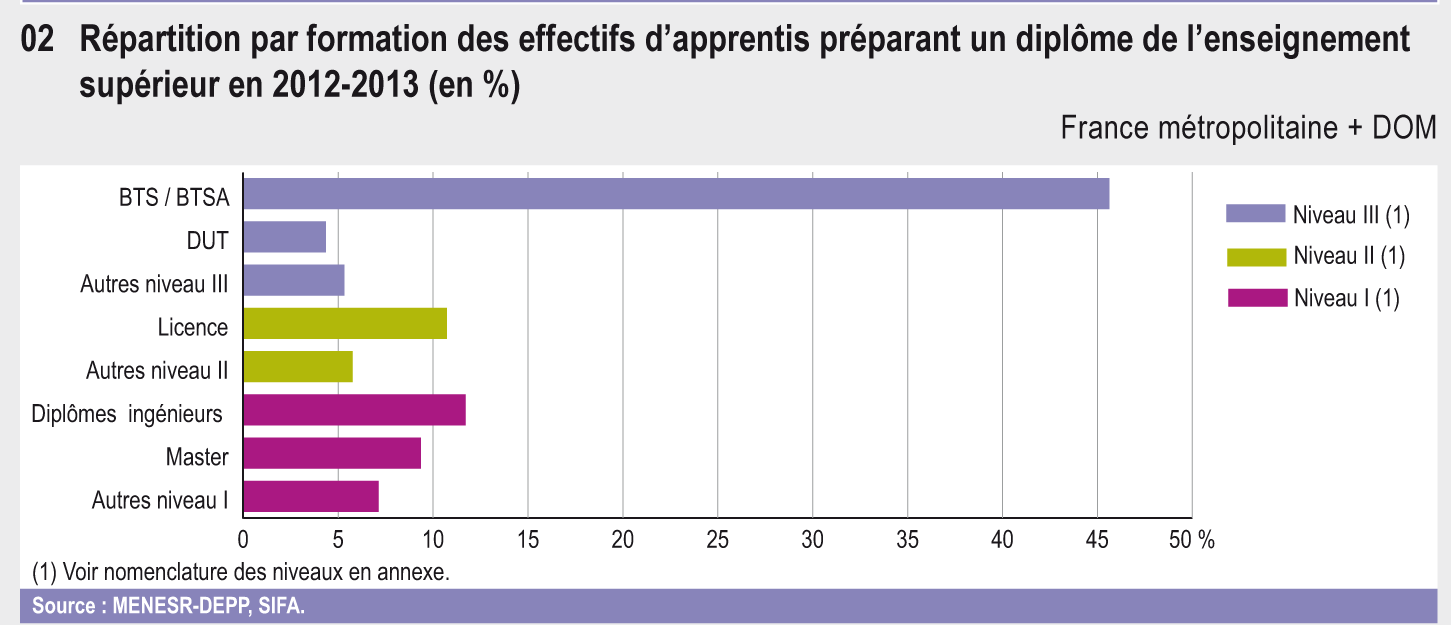 En 2012-2013, 135 400 des 438 100 apprentis suivaient une formation de l’enseignement supérieur (soit 30,9 % des apprentis). Le nombre d’apprentis y a progressé de 92 % depuis 2005 et de plus de 10 % sur la dernière année. Quel que soit le diplôme préparé, le recrutement des apprentis se fait principalement dans la voie scolaire et reste majoritairement masculin.
