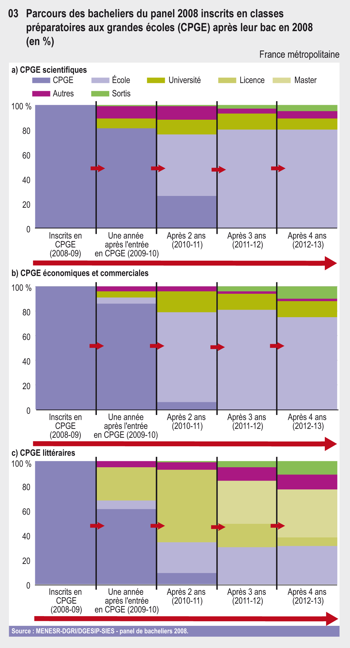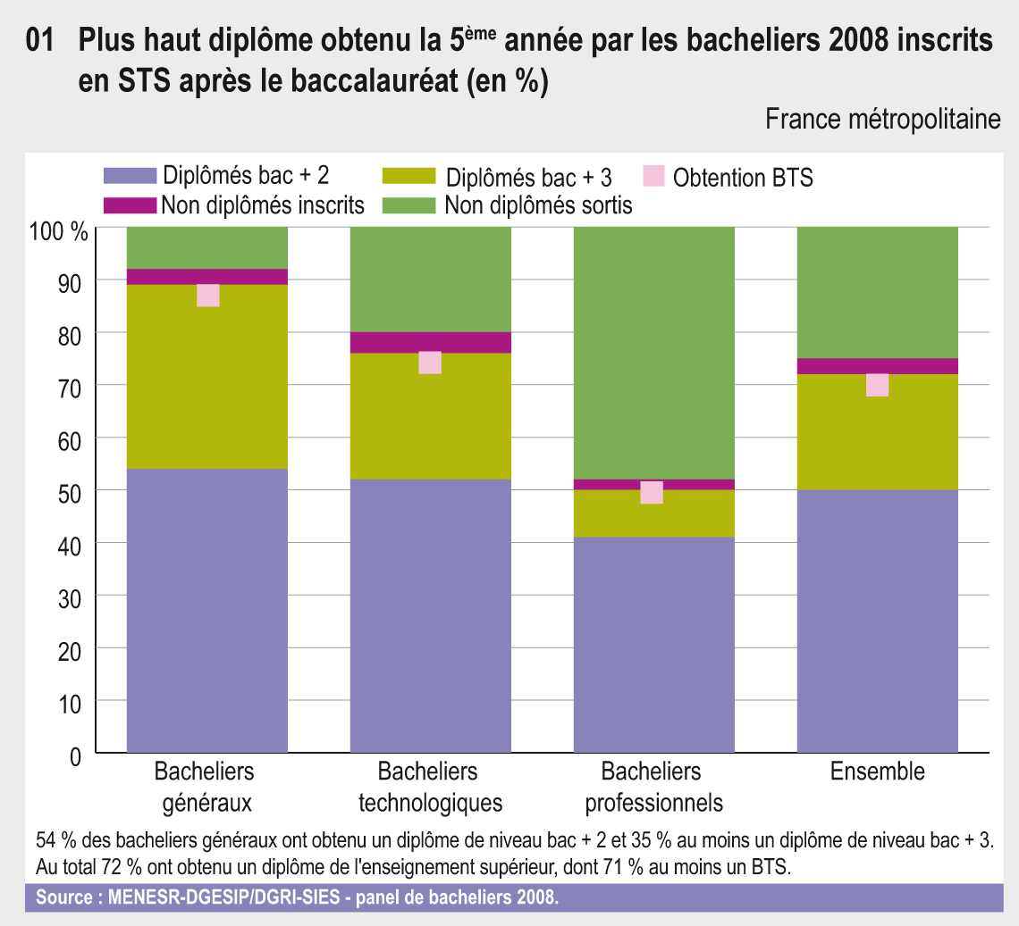 La 5ème année suivant leur baccalauréat, 72 % des étudiants entrés par la filière STS et 89 % des étudiants entrés par la filière IUT sont diplômés de l’enseignement supérieur, dont respectivement 22 % et 52 % détiennent un diplôme de niveau bac + 3. Huit bacheliers sur dix entrés en classe préparatoire scientifique ou commerciale sont inscrits au terme de deux ou trois ans dans une école menant à un diplôme de niveau bac + 5. En revanche, près de la moitié des étudiants initialement inscrits en classe littéraire ont rejoint l’université, même si leurs débouchés vers les écoles augmentent.