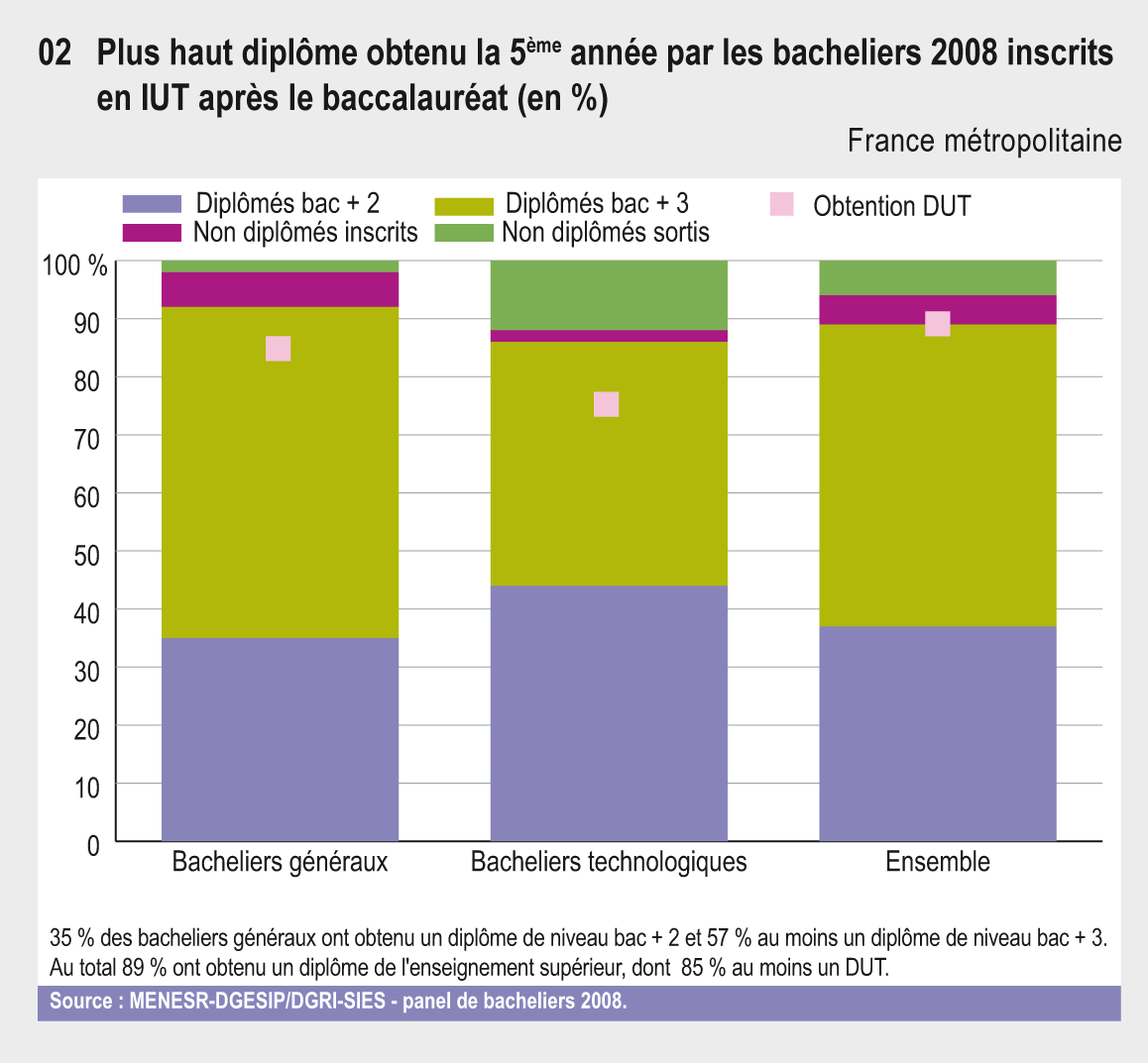35 % des bacheliers généraux ont obtenu un diplôme de niveau bac + 2 et 57 % au moins un diplôme de niveau bac + 3. Au total 89 % ont obtenu un diplôme de l'enseignement supérieur, dont 85 % au moins un DUT.