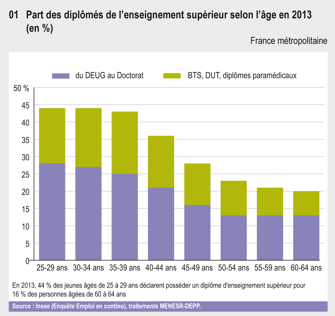 En 2013, 44 % des jeunes âgés de 25 à 29 ans déclarent posséder un diplôme d'enseignement supérieur pour 16 % des personnes âgées de 60 à 64 ans.