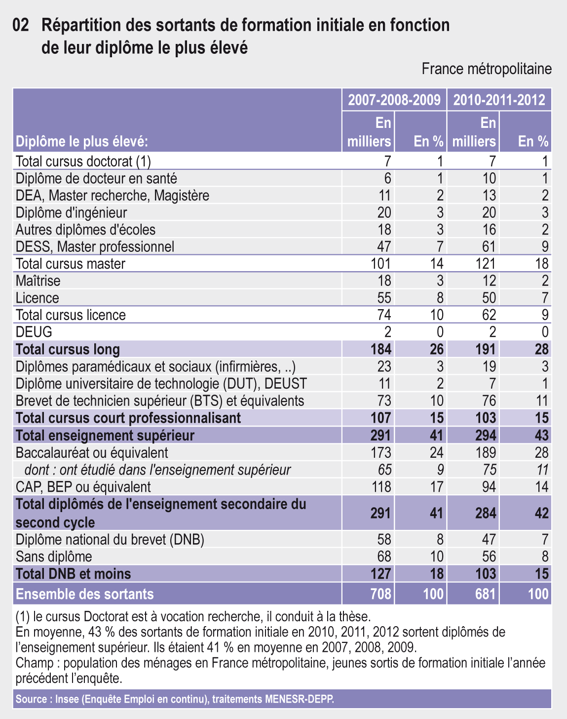 En moyenne, 43 % des sortants de formation initiale en 2010, 2011 ou 2012 sortent diplômés de l'enseignement supérieur. Ils étaient 41 % en moyenne en 2007, 2008 ou 2009.