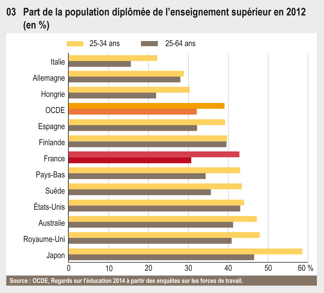 En France, les jeunes sont plus souvent diplômés de l’enseignement supérieur que les personnes plus âgées et plus souvent aussi que les jeunes vivant dans les autres pays de l’OCDE. Au début des années 2010, 43 % des jeunes sortants de formation initiale sont diplômés de l’enseignement supérieur.