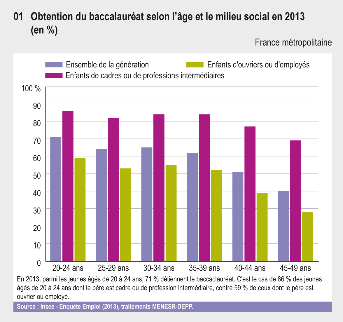 En 2013, parmi les jeunes âgés de 20 à 24 ans, 71 % détiennent le baccaclauréat. C'est le cas de 86 % des jeunes âgés de 20 à 24 ans dont le père est cadre ou de profession intermédiaire, contre 59 % de ceux dont le père est ouvrier ou employé.