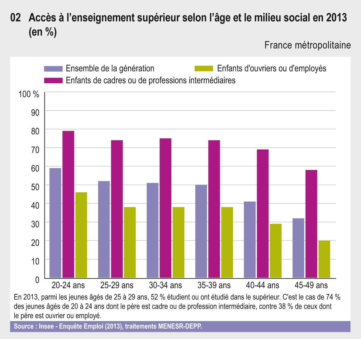 En 2013, parmi les jeunes âgés de 20 à 24 ans, 60 % étudient ou ont étudié dans supérieur. Pour cette classe d'âge, c'est le cas de 74 % des jeunes dont le père est cadre ou de profession intermédiaire, contre 38 % de ceux dont le père est ouvrier ou employé