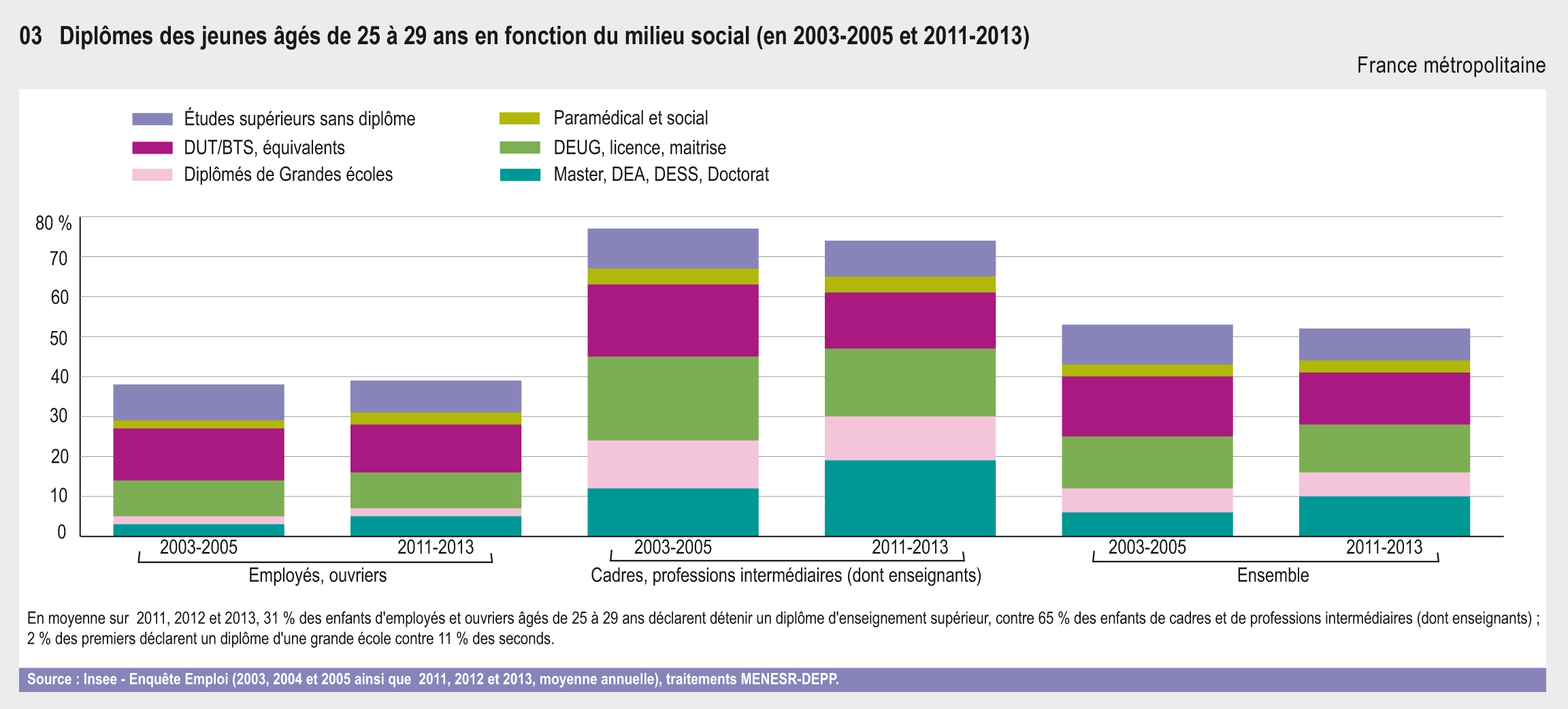 En 2011-2013, 65 % des jeunes âgés de 25 à 29 ans et enfants de cadres ou de professions intermédiaires sont diplômés du supérieur contre 31 % des enfants d’ouvriers ou d’employés (graphique 20.03). En outre, les pre¬miers possèdent un niveau plus élevé : en 2011-2013, 30 % d’entre eux sont diplômés d’un Master, d’un DEA, d’un DESS, d’un doctorat ou d’une grande école, contre seulement 7 % des enfants d’ouvriers ou d’employés. En revanche, le taux de diplômés de l’enseignement supérieur court professionnalisant varie peu selon le milieu social : 14 % des enfants de cadres ou de professions intermédiaires ont obtenu un BTS, DUT ou diplôme équivalent contre 12 % des enfants d’ouvriers ou d’employés. Ces taux sont assez stables par rapport à la période 2003-2005.