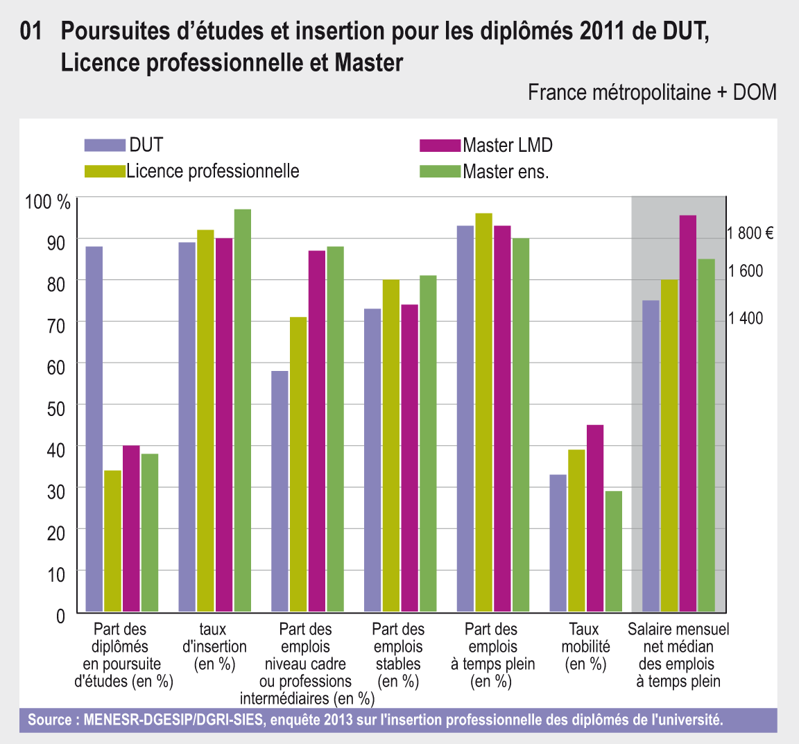 Environ 9 diplômés 2011 sur 10 de Master, Licence professionnelle et DUT sont en emploi en décembre 2013, quelque 30 mois après leur entrée dans la vie active. Les emplois occupés sont à 90 % des emplois à temps plein. Le salaire mensuel net médian des emplois à temps plein atteint 1 910 € pour les diplômés de master. Ce résultat s’accompagne d’une légère augmentation des poursuites d’études après l’obtention du diplôme.