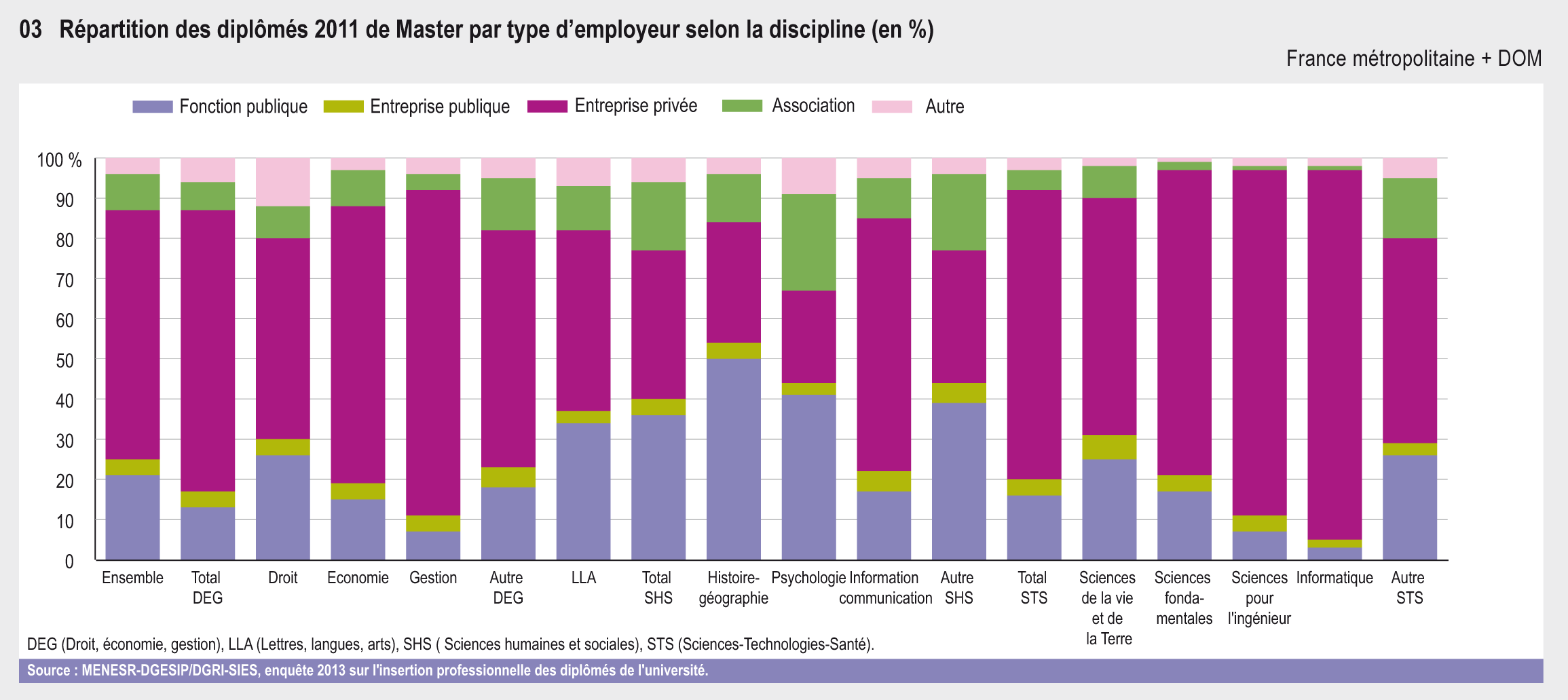 Cette fiche a été actualisée. Consultez la fiche 22. l'insertion professionnelle des diplômés de l'université (Master, DUT, LP) dans L'état de l'Enseignement supérieur et de la Recherche en France n°10 - Avril 2017