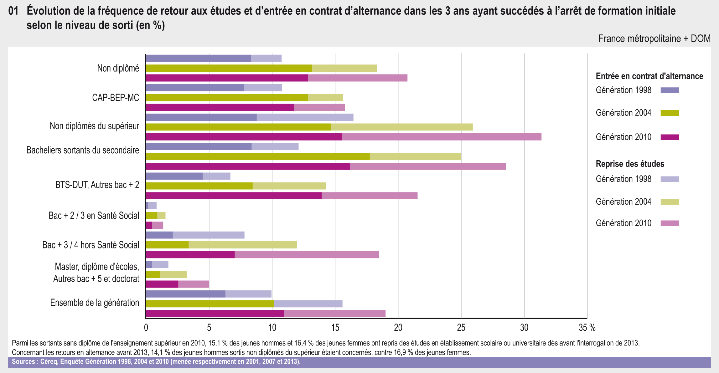 Parmi les sortants sans diplôme de l'enseignement supérieur en 2010, 15,1 % des jeunes hommes et 16,4 % des jeunes femmes ont repris des études en établissement scolaire ou universitaire dès avant l'interrogation de 2013. Concernant les retours en alternance avant 2013, 14,1 % des jeunes hommes sortis non diplômés du supérieur étaient concernés, contre 16,9 % des jeunes femmes.