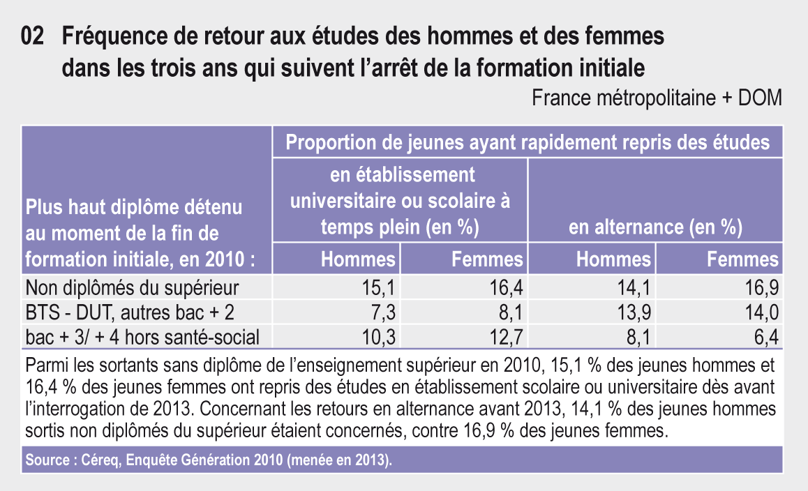 Parmi les sortants sans diplôme de l'enseignement supérieur en 2010, 15,1 % des jeunes hommes et 16,4 % des jeunes femmes ont repris des études en établissement scolaire ou universitaire dès avant l'interrogation de 2013. Concernant les retours en alternance avant 2013, 14,1 % des jeunes hommes sortis non diplômés du supérieur étaient concernés, contre 16,9 % des jeunes femmes.