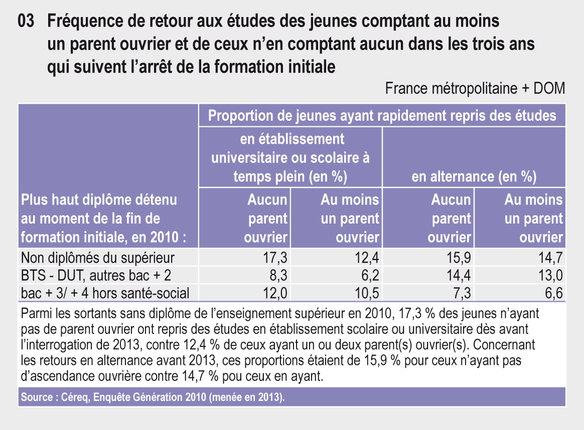 Parmi les sortants sans diplôme de l'enseignement supérieur en 2010, 17,3 % des jeunes n'ayant pas de parent ouvrier ont repris des études en établissement scolaire ou universitaire dès avant l'interrogation de 2013, contre 12,4 % de ceux ayant un ou deux parent(s) ouvrier(s). Concernant les retours en alternance avant 2013, ces proportions étaient de 15,9 % pour ceux n'ayant pas d'ascendance ouvrière contre 14,7 % pou ceux en ayant.