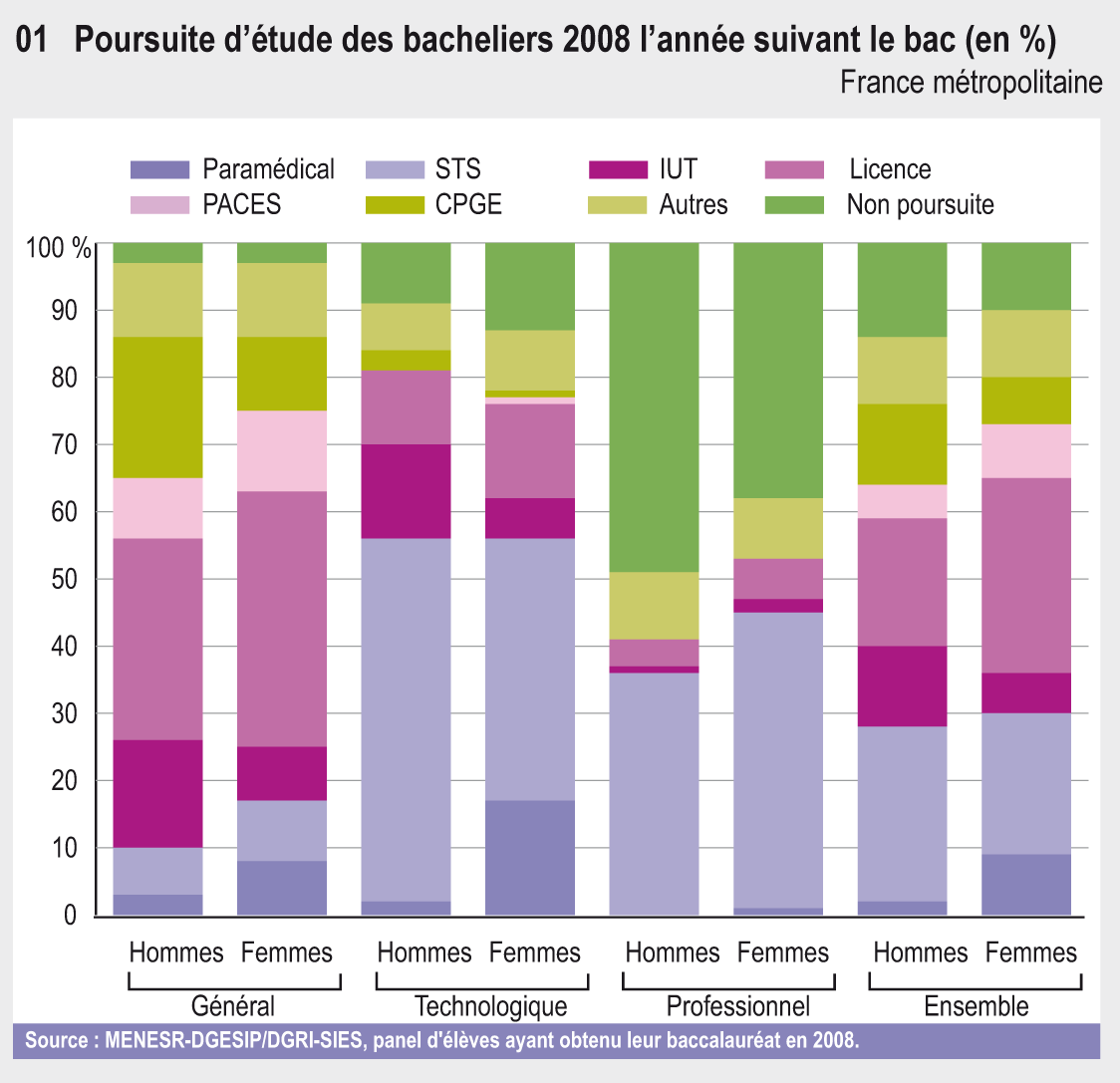 Après une scolarité au cours de laquelle elles ont en moyenne de meilleurs résultats que les garçons, les filles sont plus nombreuses à obtenir le baccalauréat : en 2014 dans une génération, 84,2 % des filles deviennent bachelières contre 70,9 % des garçons.