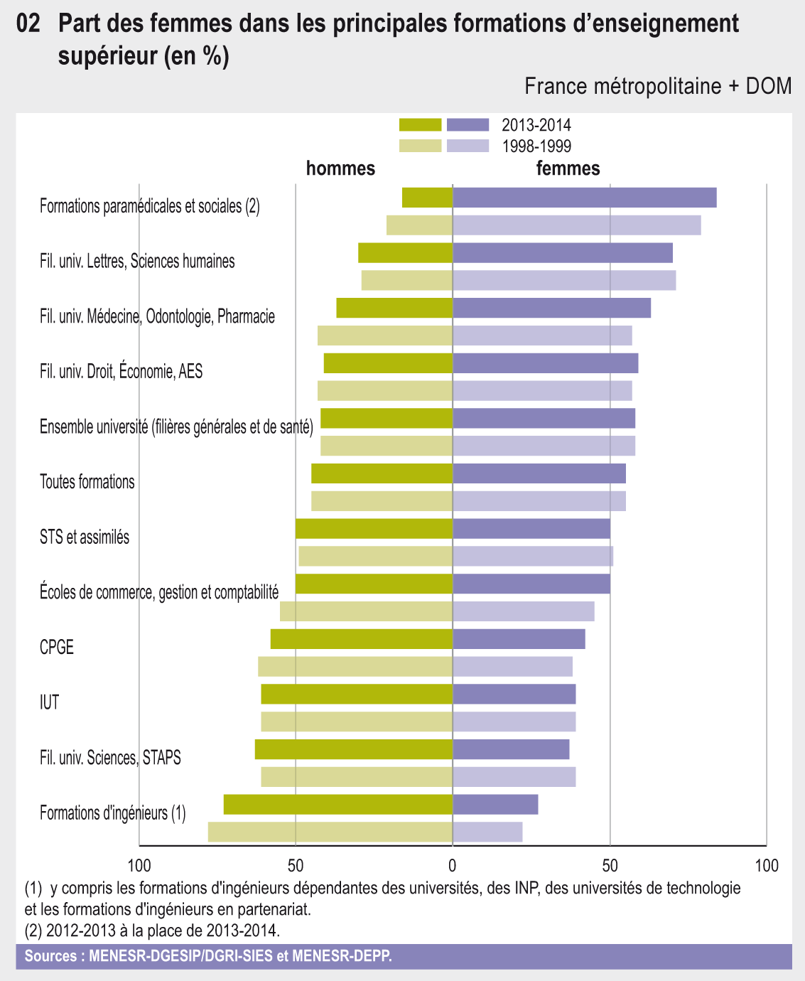 Cette fiche a été actualisée. Consultez la fiche 13. la parité dans l’enseignement supérieur dans L'état de l'Enseignement supérieur et de la Recherche en France n°10 - Avril 2017