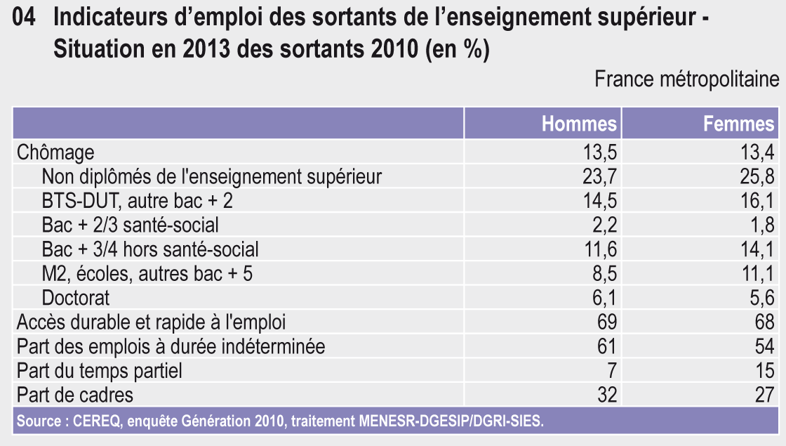 Les femmes, plus nombreuses que les hommes dans l'enseignement supérieur, s'inscrivent moins souvent dans les filières sélectives ou scientifiques et sont minoritaires en Doctorat. Leur taux de chômage en 2013, trois ans après leur sortie de l’enseignement supérieur, est plus élevé à presque tous les niveaux de diplôme, et leurs conditions d'emploi sont moins favorables [Consulter cette page]