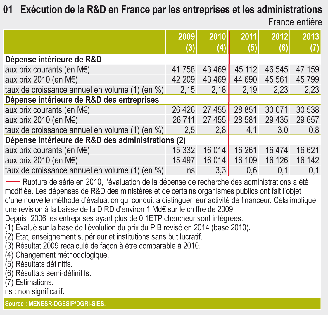 En 2013, la dépense intérieure de recherche et développement (DIRD) s'établit à 47,5 milliards d'euros, soit une hausse de 1,0 milliards d'euros par rapport à 2012. Corrigée de l'évolution des prix, la DIRD a progressé de 1,3 % en 2013. La DIRD des entreprises est en hausse de 1,4 % en volume, tandis que celle des administrations augmente de 1,0 %. L'effort de recherche, qui rapporte la DIRD au produit intérieur brut (PIB), atteint 2,24 % en 2013, après 2,23 % en 2012. Il a augmenté de 0,22 point depuis 2007.