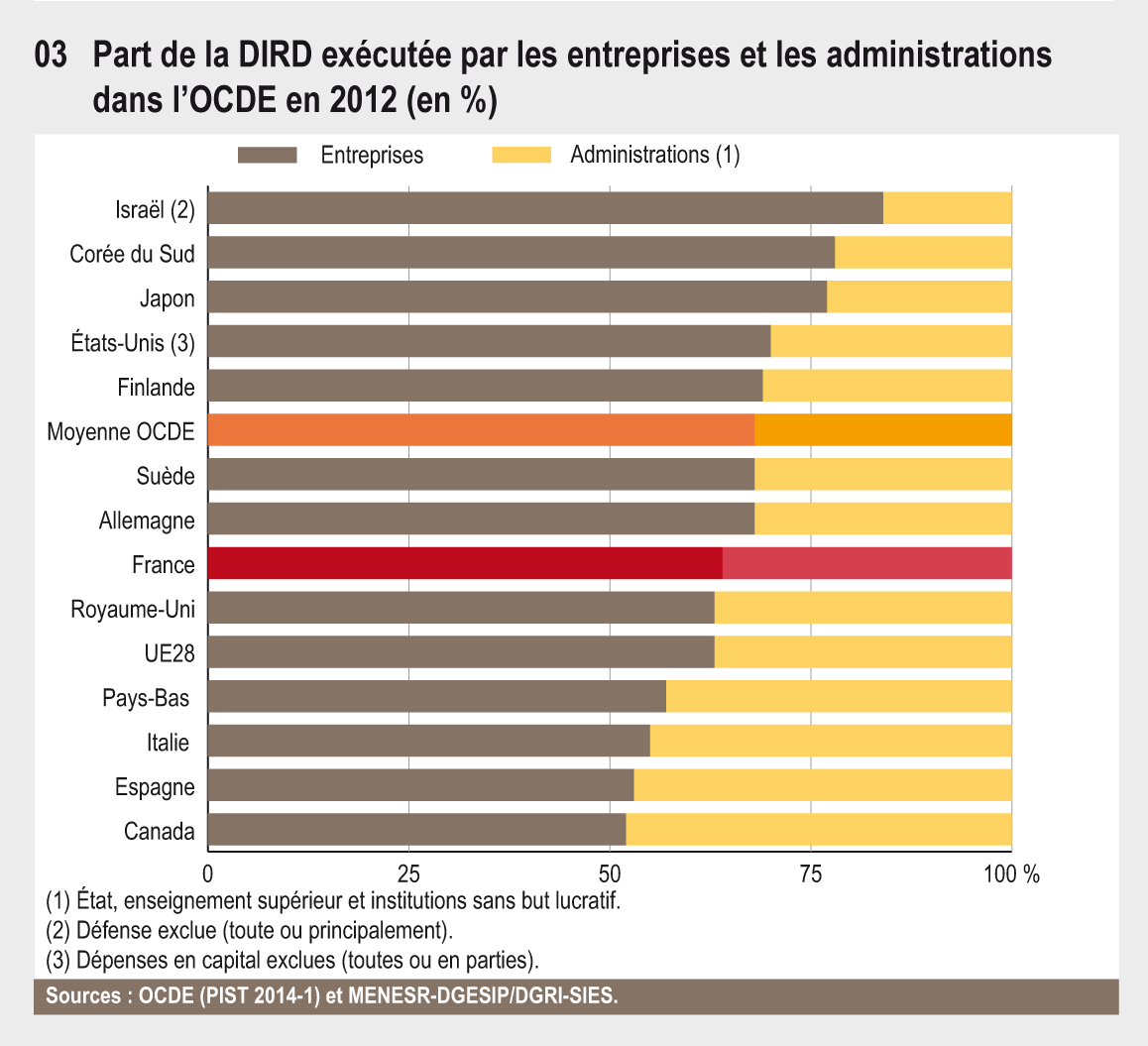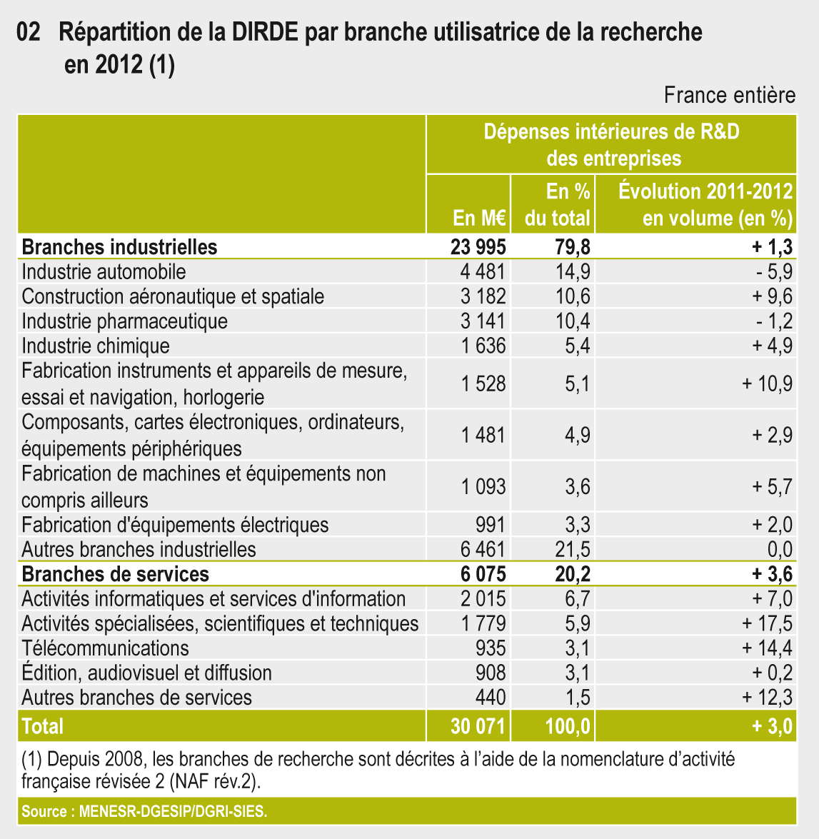 En 2012, la moitié de la dépense intérieure de R&D des entreprises se concentre au bénéfice de six des 32 branches d'activités bénéficiaires de travaux de R&D (Automobile, Aéronautique, Pharmacie, Activités informatiques et service d’information, Activités spécialisées, scientifiques et techniques et Chimie). Dans le secteur public, les organismes de recherche (EPST, EPIC) exécutent 55 % de la dépense intérieure de R&D des administrations.