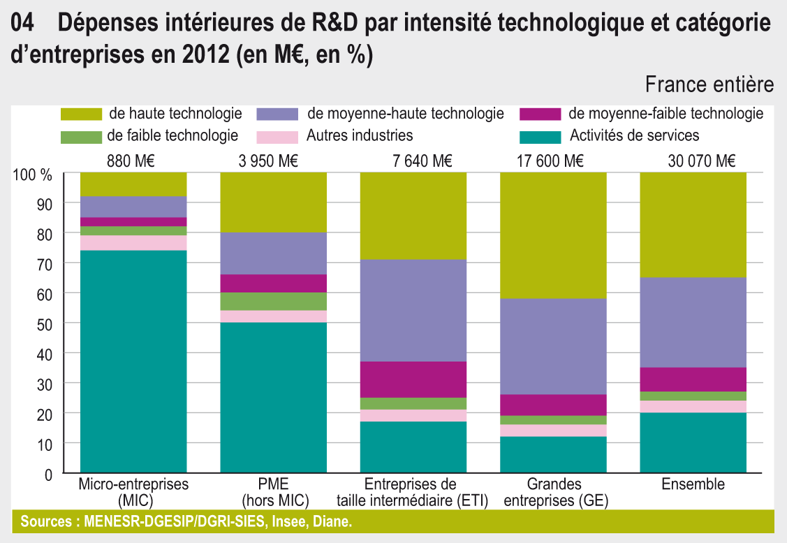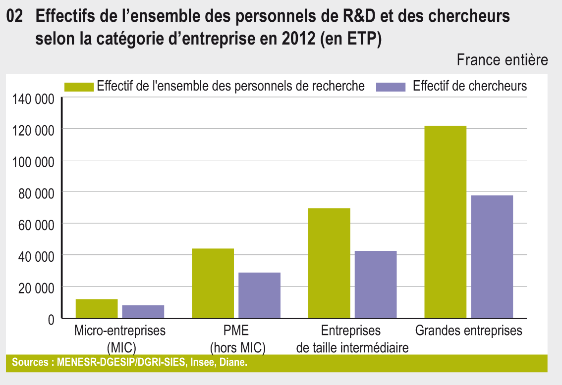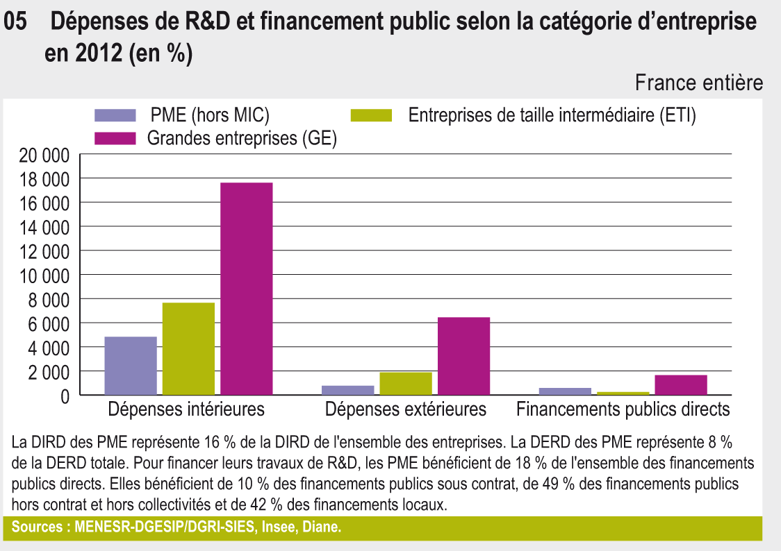 En 2012, les PME représentent 86 % des entreprises ayant réalisé des activités de R&D en France. Elles effectuent 16 % des dépenses intérieures de R&D des entreprises (DIRDE), dont la moitié en faveur des activités de services. Les grandes entreprises, à l’origine de 59 % de la DIRDE, réalisent les trois-quarts de leur effort dans les industries de haute et moyenne-haute technologie.