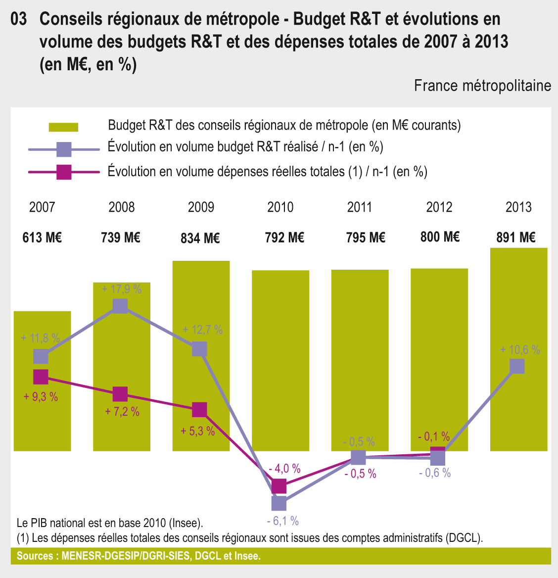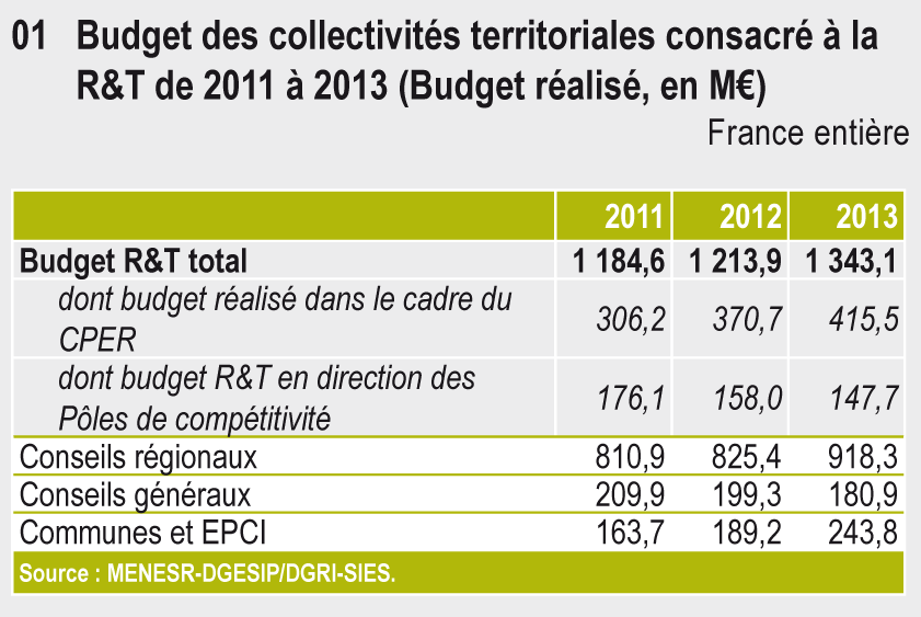 Depuis 2003, l'enquête annuelle sur les budgets de R&T conduite par le département des études statistiques (MENESR - SCSESR - SIES - A2.3) permet une mesure des budgets engagés ou dépensés par les collectivités territoriales pour le soutien à la recherche.