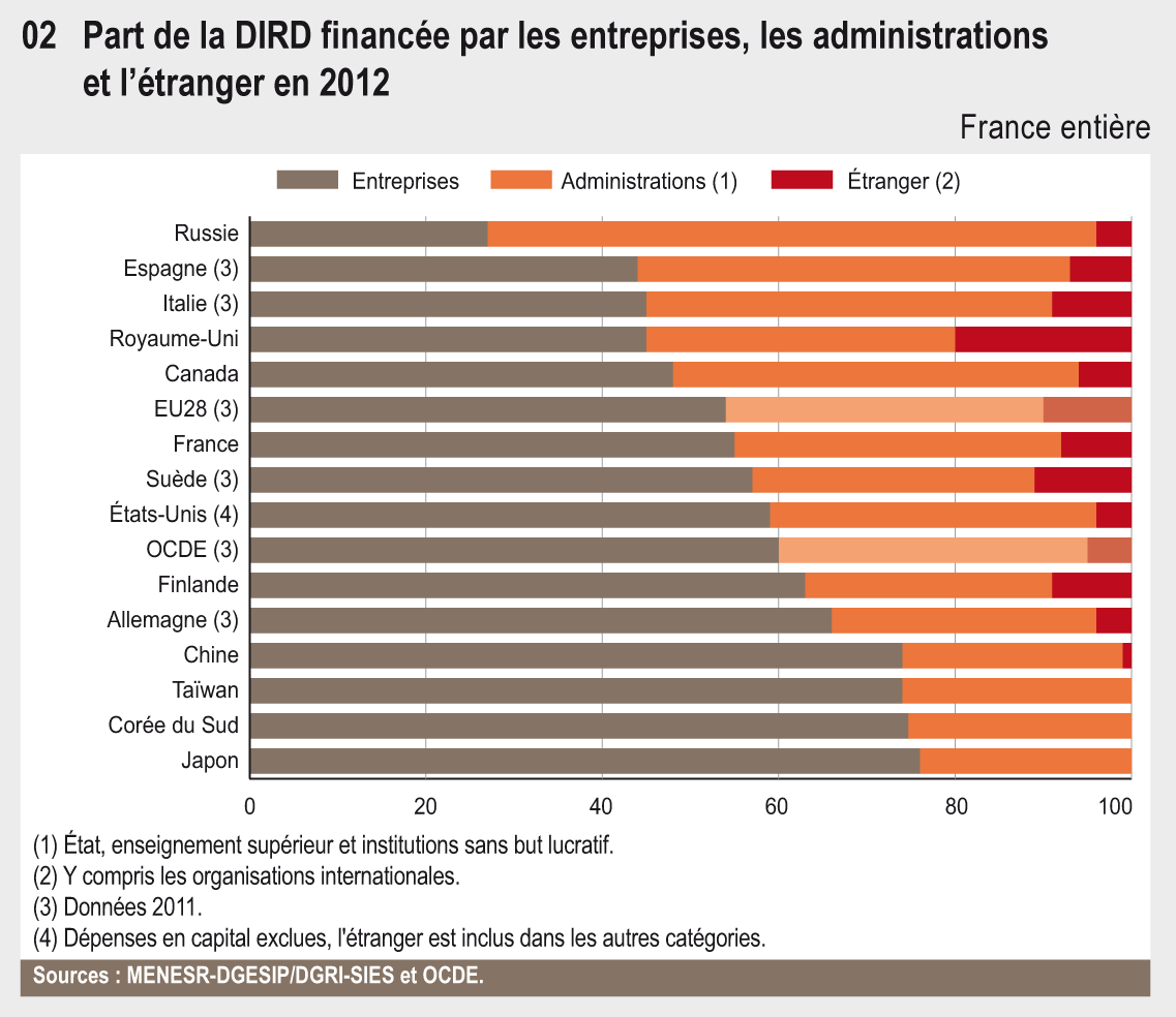 Le financement de la recherche nationale (DNRD) repose majoritairement (60 %) sur les entreprises. Les entreprises implantées sur le territoire national financent environ 55 % de la dépense intérieure de recherche (DIRD). Ce niveau de financement par le secteur privé est très inférieur à celui observé au Japon, en Allemagne et aux États-Unis.