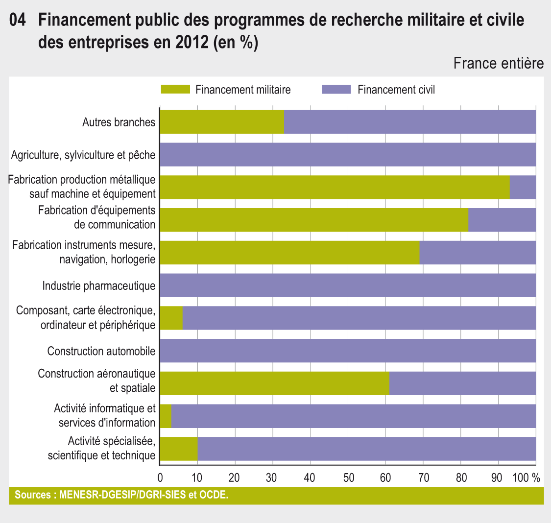 Du fait de l’importance des programmes de recherche militaire, 48 % des financements publics pour des contrats de R&D adressés aux entreprises proviennent du ministère de la Défense. Ils restent donc concentrés au bénéfice de quelques branches de recherche. Quatre branches reçoivent près de la moitié des financements publics : la « Construction aéronautique et spatiale » (28 %), la « Fabrication d’équipements de communication » (10 %), la « Fabrication de production métallique sauf machine et équipement » (9 %) et la « Fabrication d'instruments de mesure, de navigation, et d'horlogerie » (9 %).