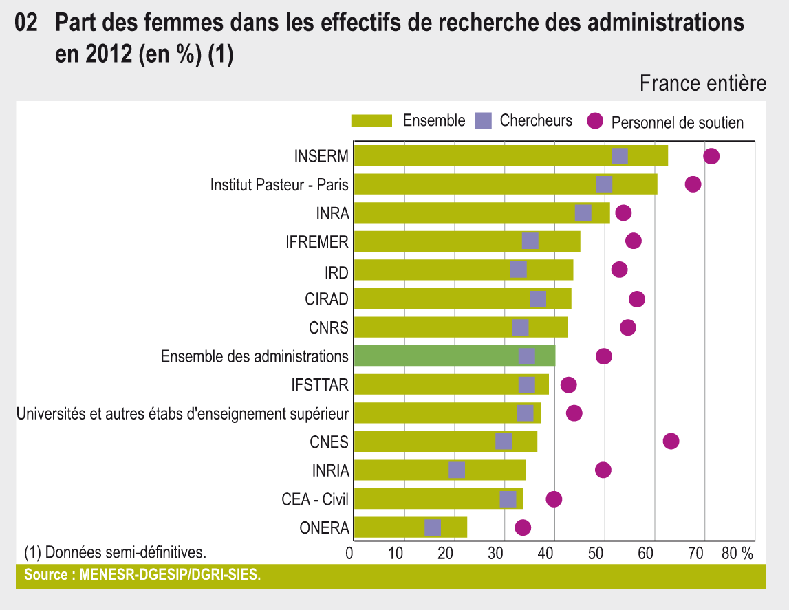 Cette fiche a été actualisée. Consultez la fiche 36. la parité dans la recherche dans L'état de l'Enseignement supérieur et de la Recherche en France n°10 - Avril 2017