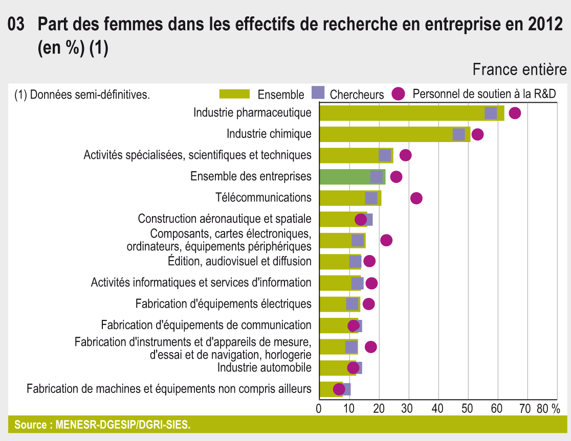 La similitude de la place des femmes parmi les chercheurs du public où les sciences médicales et de la vie sont dominantes , et dans l'industrie pharmaceutique en est un exemple.