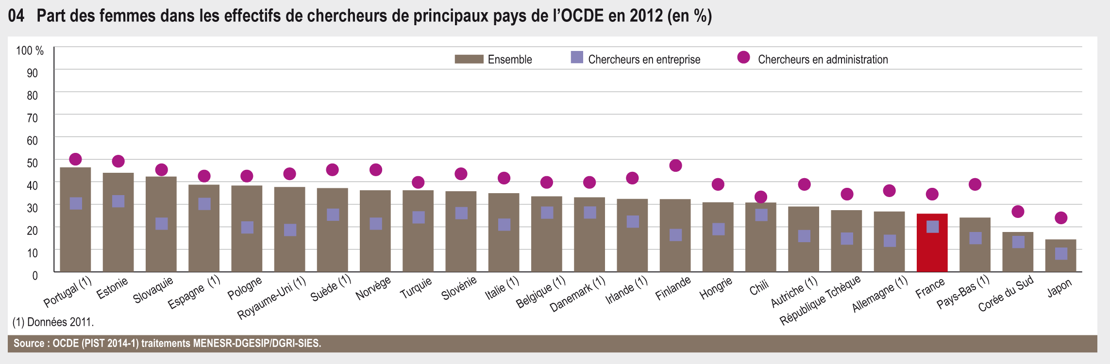 Les tendances observées en France sont semblables à celles observées dans les autres pays de l’OCDE. Partout, on constate une sous-représentation féminine dans les équipes de chercheurs, particulièrement dans les entreprises (graphique 36.04). Portugal, Estonie et Slovaquie s’approchent néanmoins de la parité hommes-femmes. Dans ces pays, elles représentent plus de 40 % des effectifs nationaux de chercheurs. A contrario, en Corée du Sud et au Japon, moins de 20 % des chercheurs sont des femmes. La situation de la France est proche de celle de l’Allemagne (27 %).