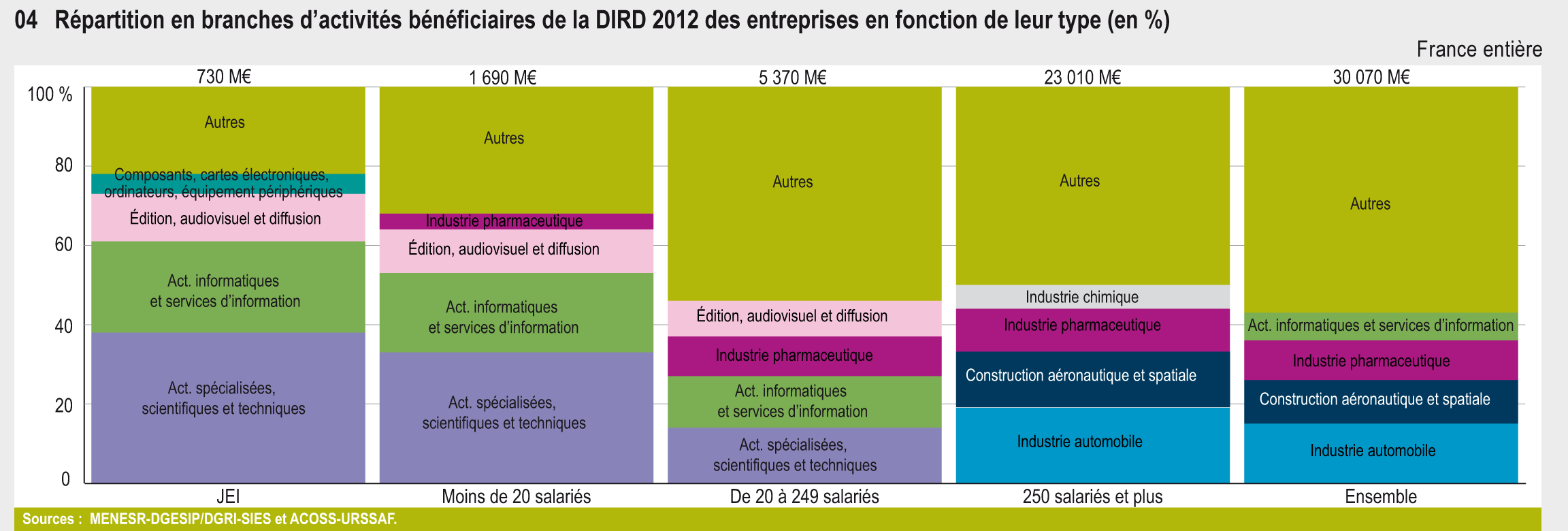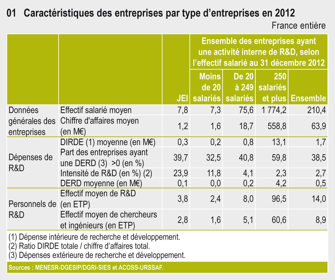 Le statut de jeune entreprise innovante (JEI) a été créé pour favoriser la création et le développement des PME qui conduisent des travaux de R&D. En 2012, leurs dépenses de R&D s’élèvent à 730 millions d’euros et se concentrent essentiellement dans des branches de services.