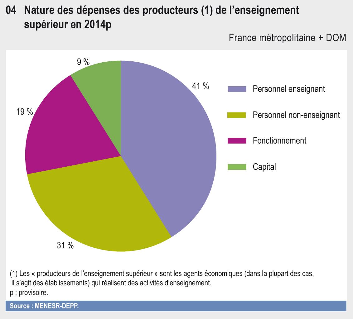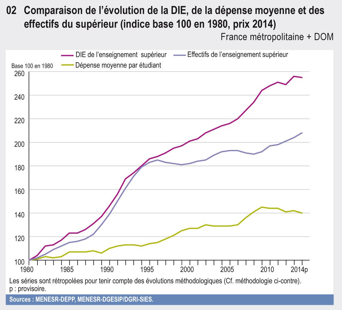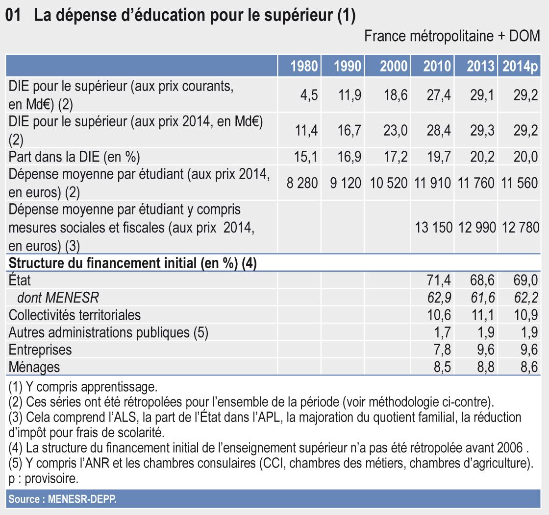 En 2014, la collectivité nationale (État, collectivités territoriales, autres administrations publiques, ménages et entreprises) a consacré 29,2 milliards d'euros à l'enseignement supérieur, soit une baisse de 0,3 % par rapport à 2013 (en euros constants). Depuis 1980, la dépense pour l'enseignement supérieur a connu une forte croissance, de 2,8 % en moyenne annuelle. Son poids dans la dépense intérieure d'éducation (DIE) est passé de 15,1 % en 1980 à 20,0 % en 2014 (tableau 01.01).