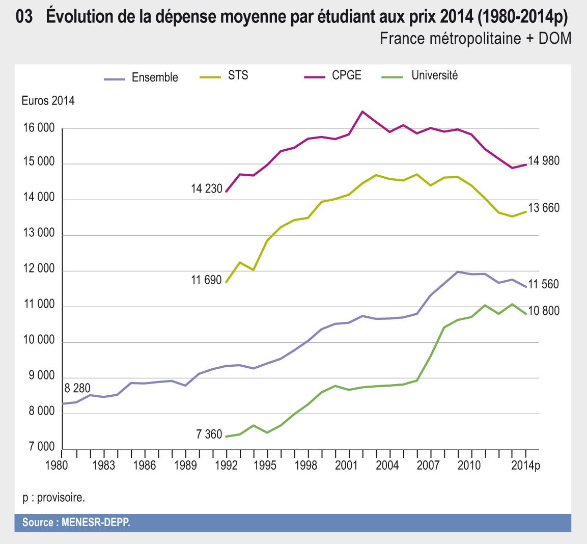 La collectivité nationale a consacré 29,2 milliards d'euros (Md€) à l'enseignement supérieur en 2014. C'est 2,6 fois plus qu'en 1980 (en euros constants). L'État y participe pour 69 %. En 2014, la dépense moyenne par étudiant s'élève à 11 560 euros, soit 40 % de plus qu'en 1980 (en euros constants).