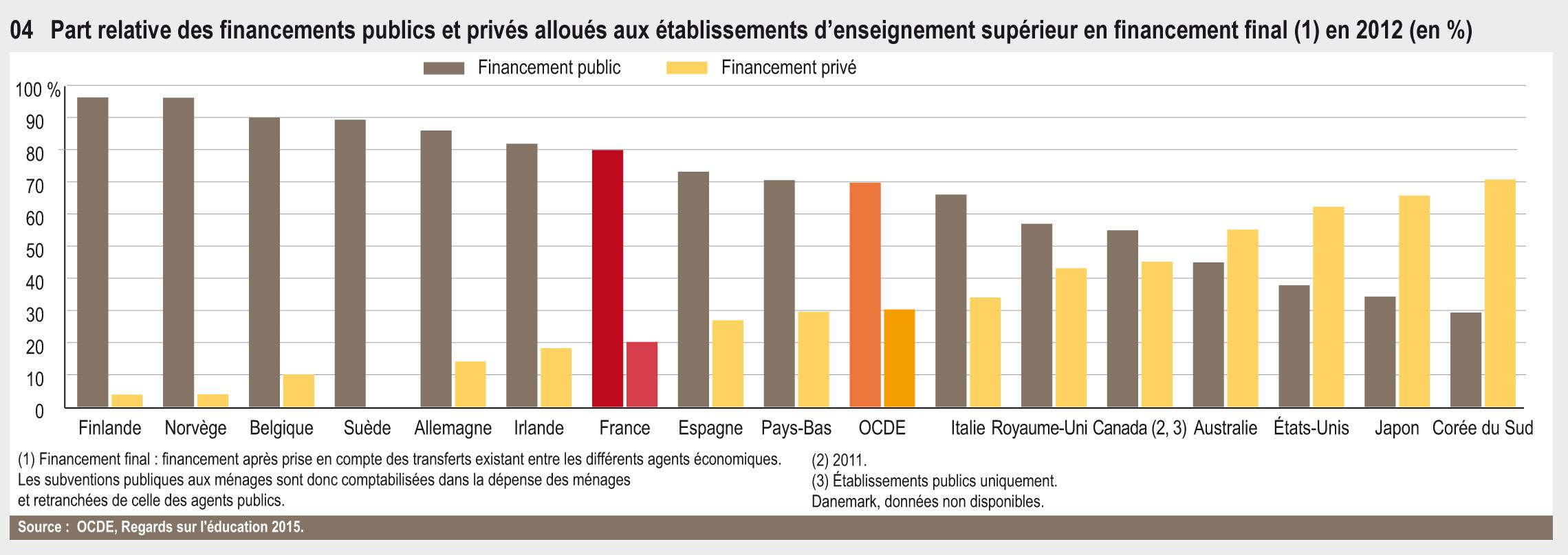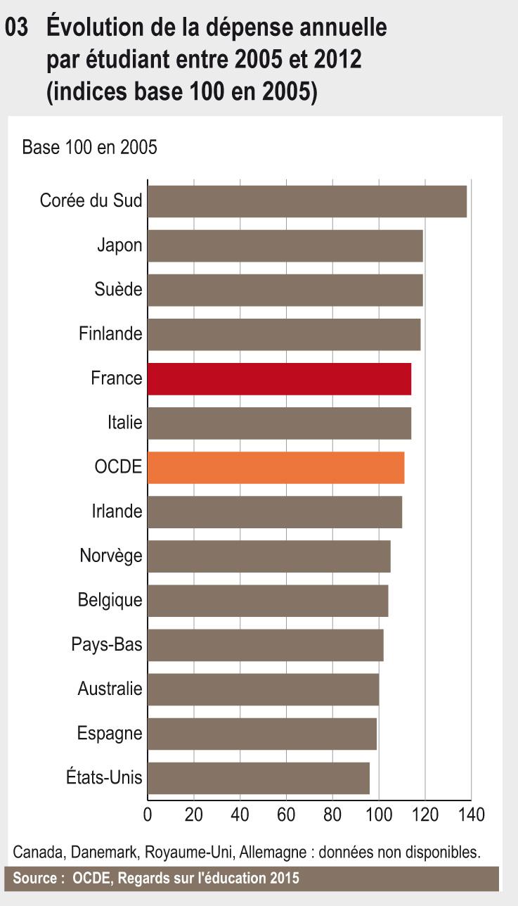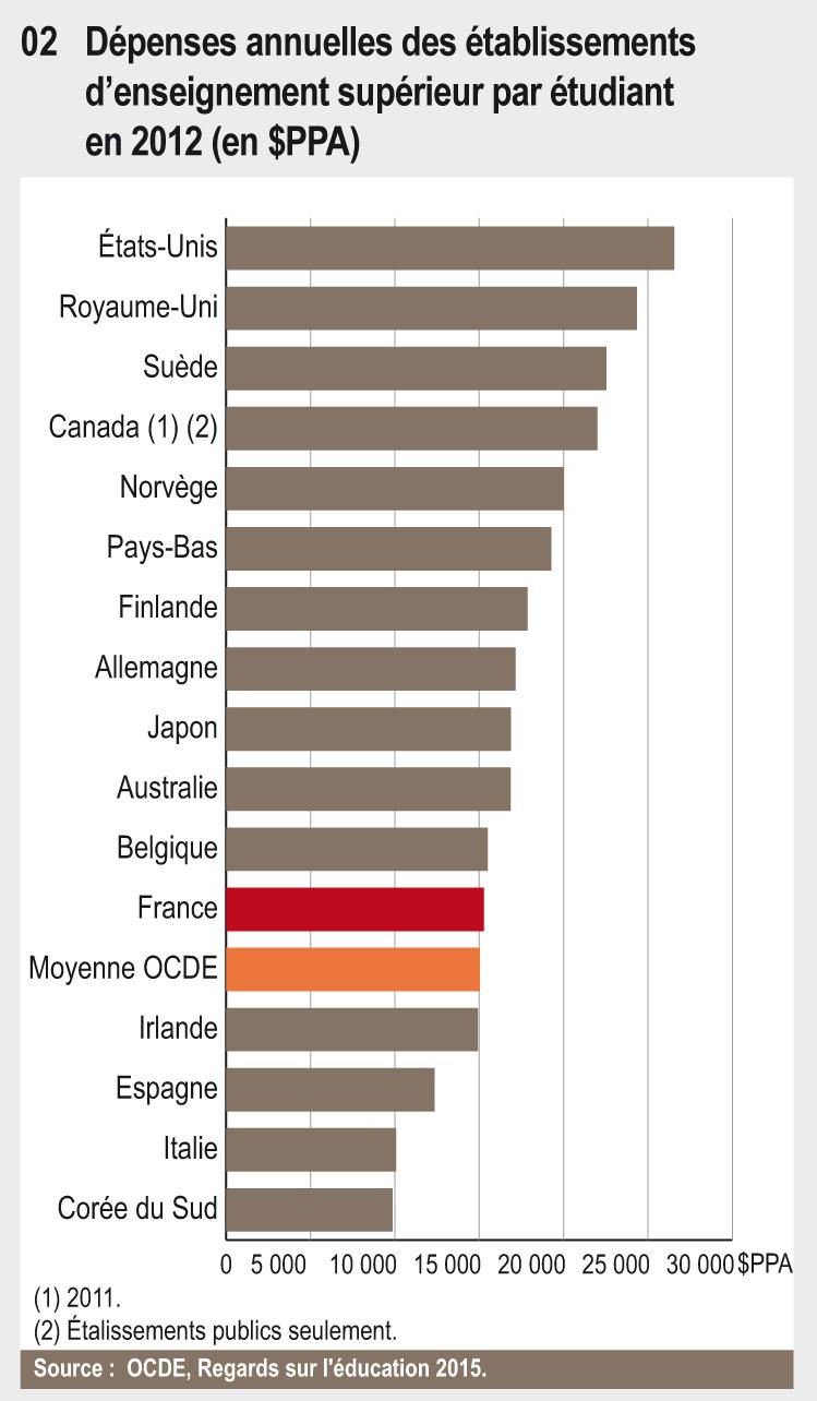 En 2012, la dépense moyenne par étudiant en France est proche de la moyenne des pays de l’OCDE. Depuis 2005, elle a progressé plus vite que dans la plupart des autres pays, rattrapant ainsi une grande partie de son retard. Cependant, l’effort national consacré à l’enseignement supérieur reste légèrement en dessous de la moyenne (1,4 % du PIB contre 1,5 %).