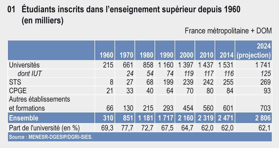 Les effectifs de l'enseignement supérieur ont été multipliés par 8 en 50 ans (tableau 09.01). Ils sont ainsi passés de 310 000 étudiants inscrits en 1960 à 2 471 000 en 2014. Les évolutions démographiques devraient se traduire par une nouvelle progression dans les 10 ans à venir, avec des effectifs qui dépasseraient 2 800 000 en 2024. Un nouvel accroissement de la proportion de bacheliers dans une génération ou des taux de poursuite dans l’enseignement supérieur pourraient encore amplifier cette progression.