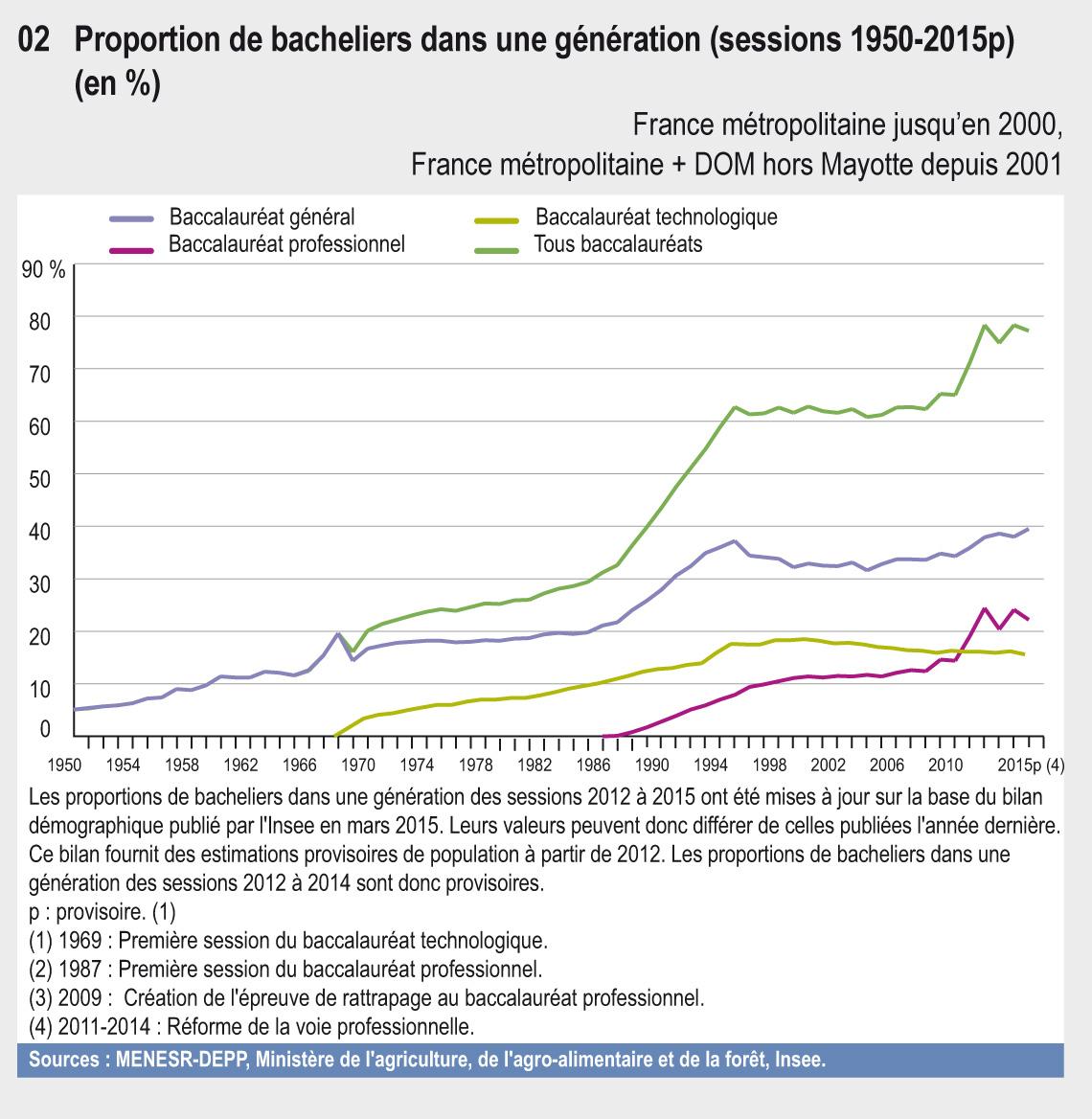 09.02 Proportion de bacheliers dans une génération (sessions 1950-2015 p) (en %)
