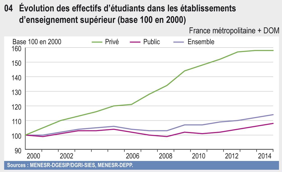 Depuis 2000, les effectifs de l’enseignement supérieur privé ont cru de 58 %, alors que les effectifs totaux progressaient de 14 % sur la même période. Le secteur privé compte 438 000 étudiants en 2014, ce qui représente un étudiant sur six (graphique 09.04). Il accueille environ un tiers des effectifs des STS et des écoles d'ingénieurs, et la totalité des écoles de commerce et de management.