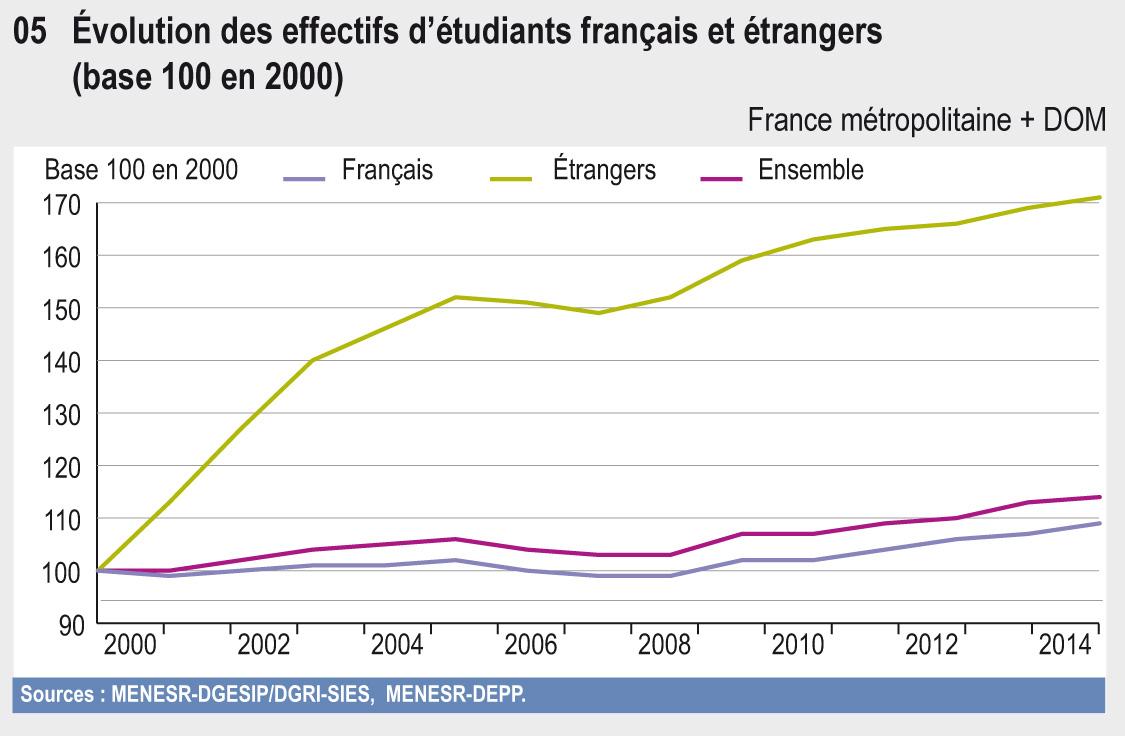 La croissance des effectifs de l'enseignement supérieur français sur les 15 dernières années s'explique aussi en grande partie par l'accroissement du nombre d’'étudiants étrangers (graphique 09.05), issus de systèmes éducatifs étrangers pour la plupart. Ils représentent 12,1 % des étudiants contre 8,1 % en 2000.