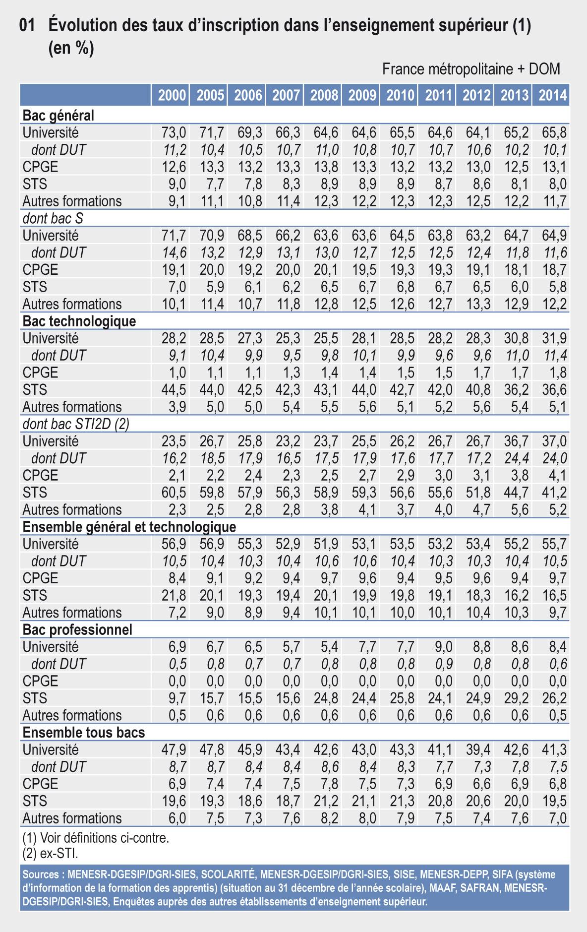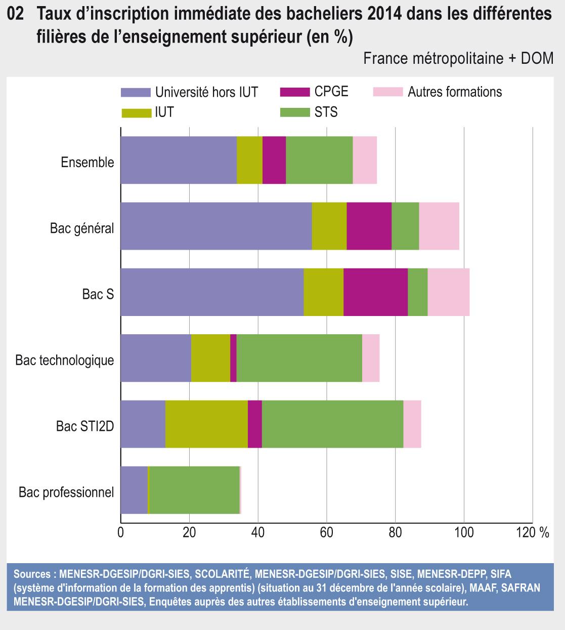 Environ 75 % des bacheliers 2014 s'inscrivent immédiatement dans l'enseignement supérieur. Près des deux-tiers des bacheliers généraux s'inscrivent à l'université, soit 7 points de moins qu'en 2000 mais 2,7 points de plus qu’en 2012. Près d'un bachelier technologique sur deux s'inscrit dans une filière professionnelle courte. Les bacheliers professionnels, dont les effectifs ont considérablement augmenté avec la réforme de la voie professionnelle, sont tendanciellement plus nombreux à s'inscrire dans l'enseignement supérieur.