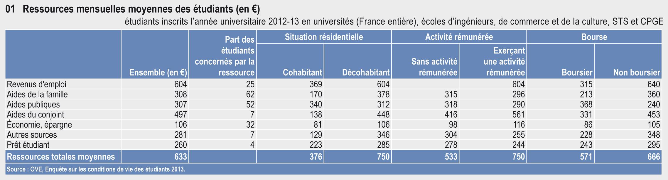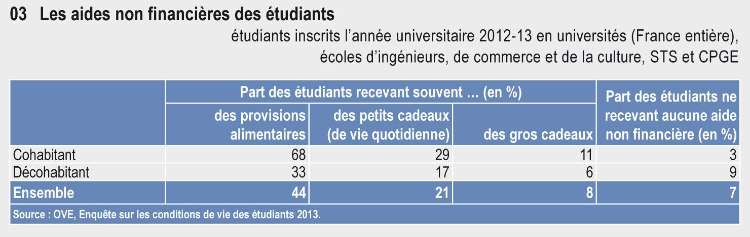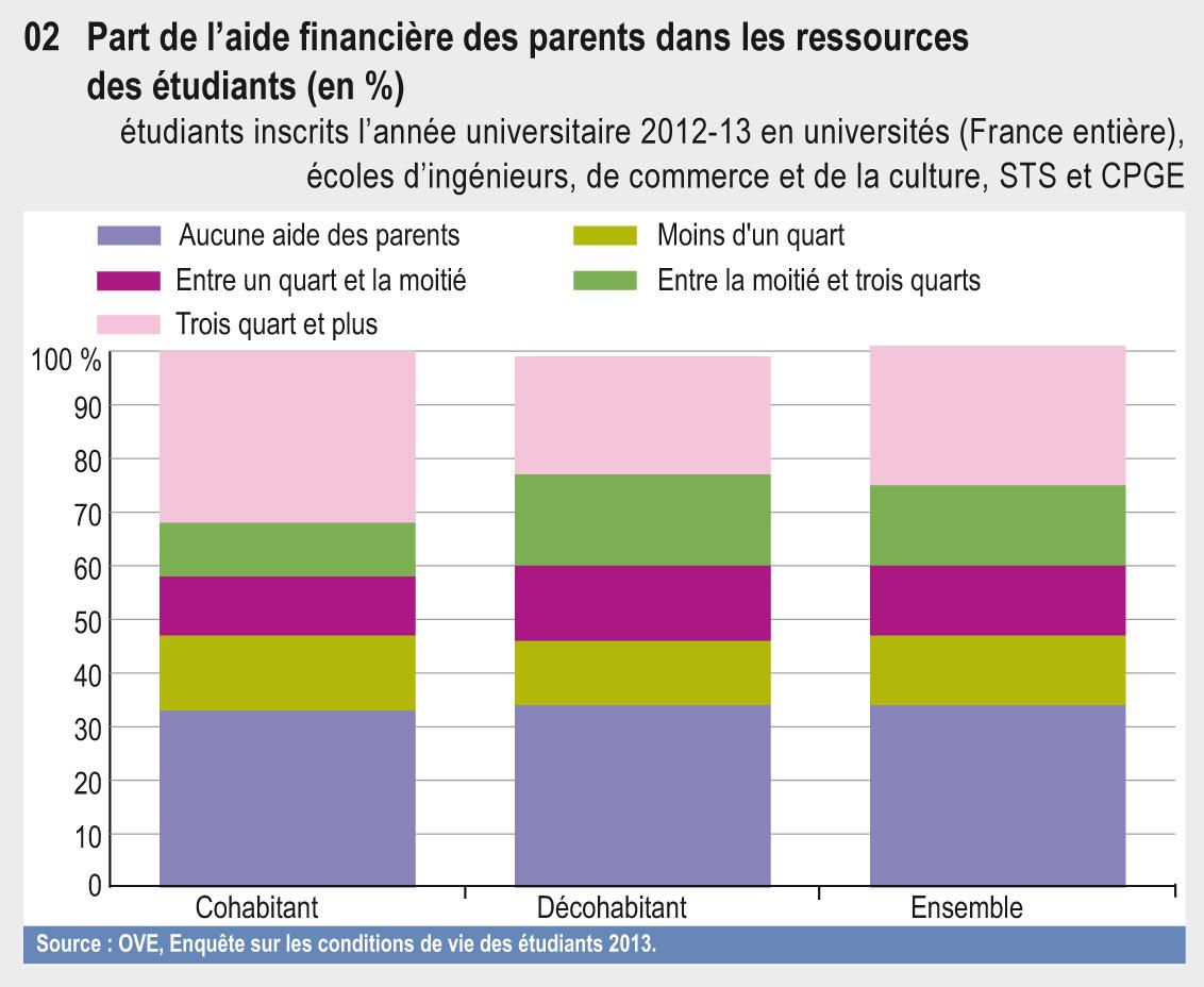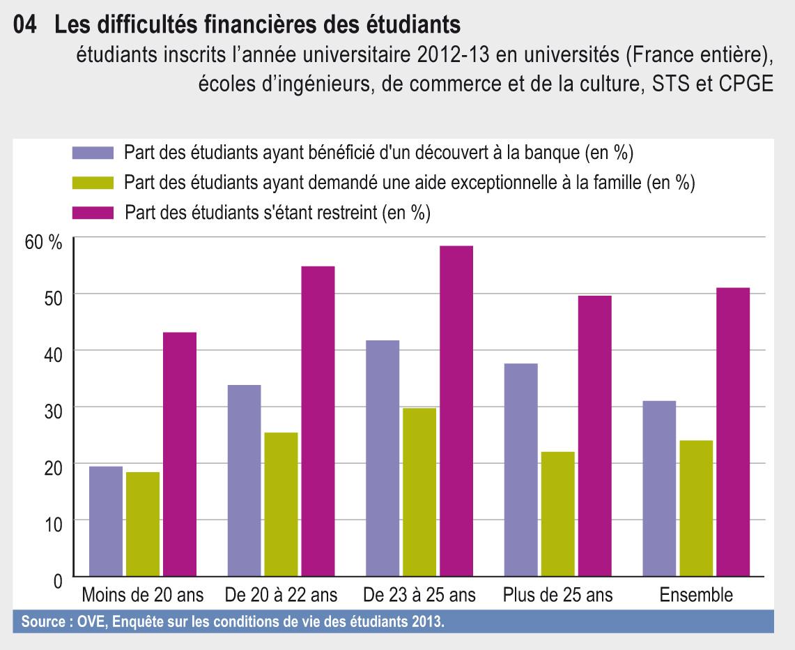 En 2013, deux tiers des étudiants sont, au moins en partie, dépendants financièrement de leurs parents. Pour 40 % des étudiants, les aides des parents représentent même plus de la moitié de leurs ressources. Parallèlement, plus d’un étudiant sur deux déclare être confronté à des difficultés financières.