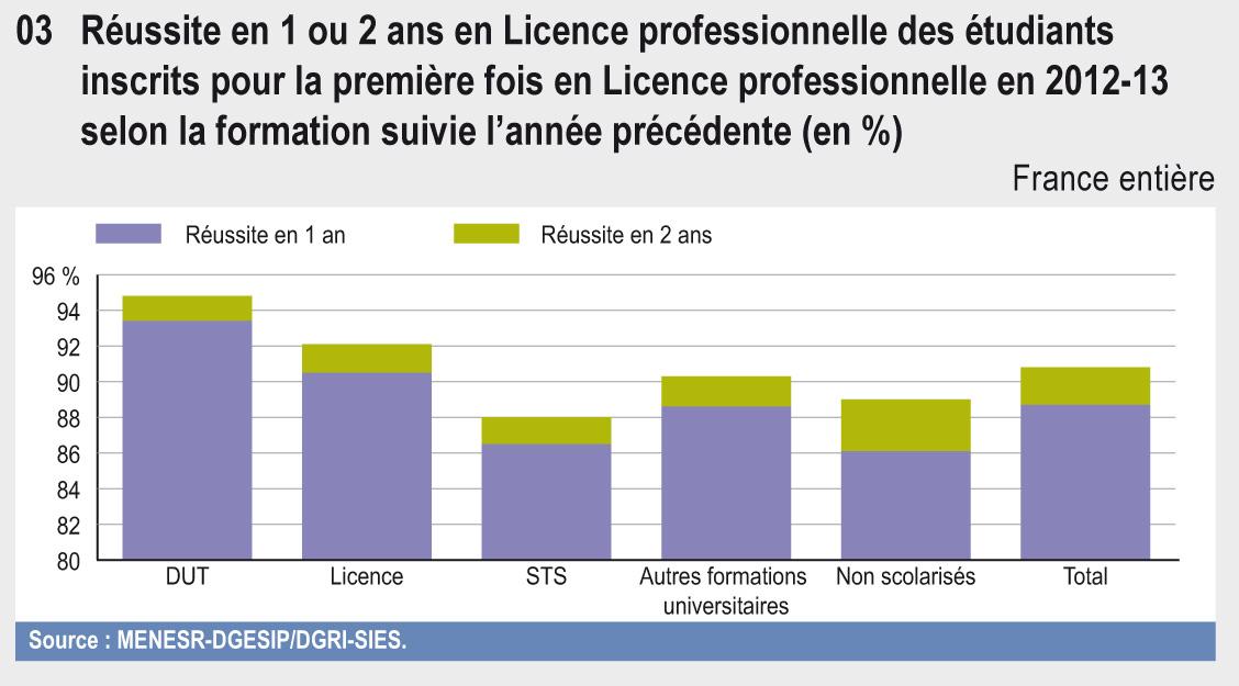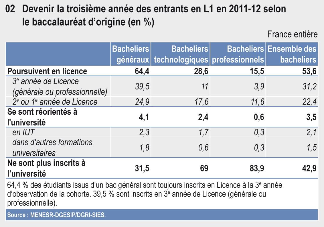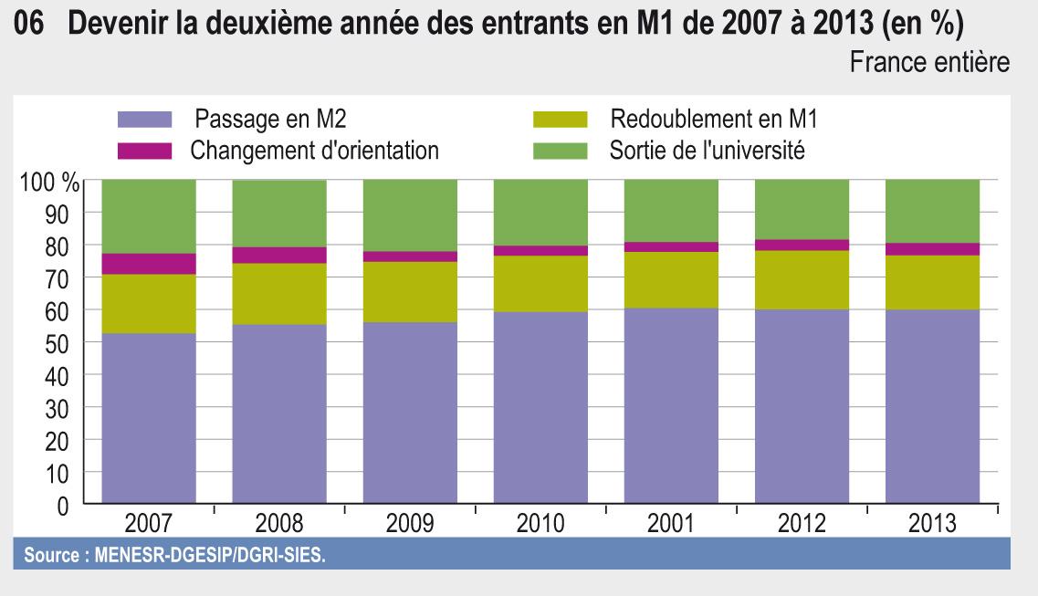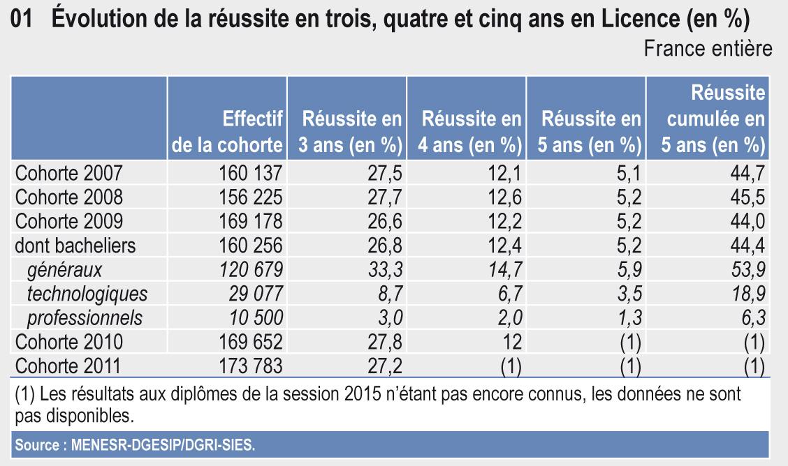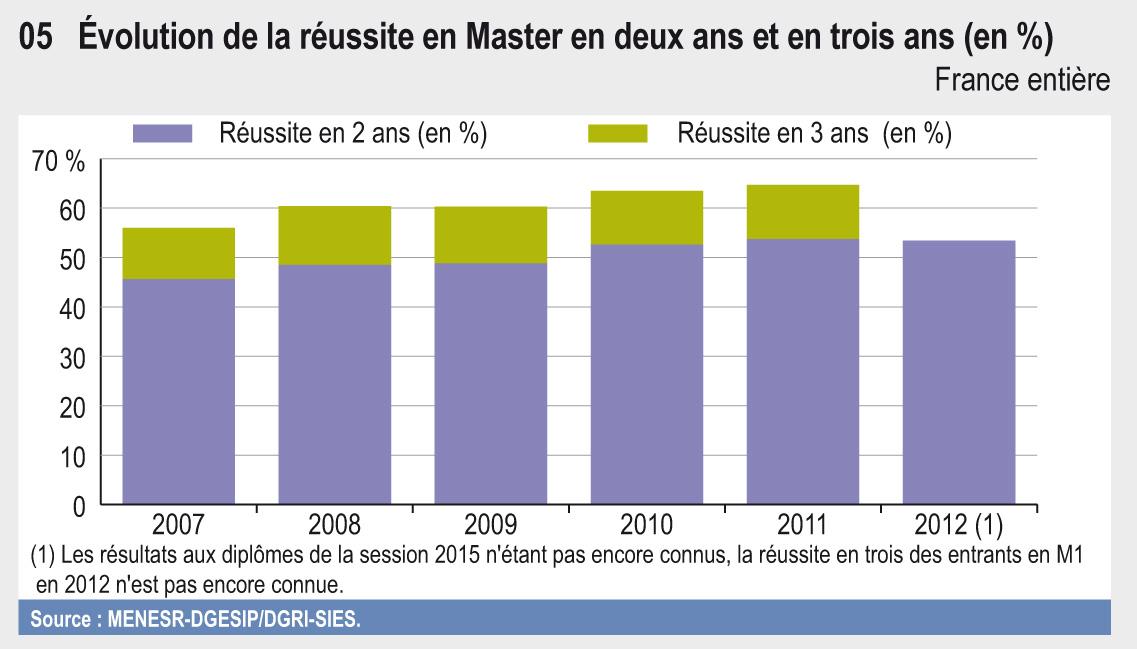 À l’université, 28 % des étudiants obtiennent leur Licence 3 ans après leur première inscription en L1 et 40 % après 3 ou 4 ans. Ces taux évoluent peu au cours des dernières années. Près des trois quarts des licenciés s’inscrivent en Master l’année suivante. La réussite en Master a fortement progressé depuis 2007 ; près de 54 % des étudiants obtiennent désormais leur diplôme en deux ans et 65 % en deux ou trois ans.