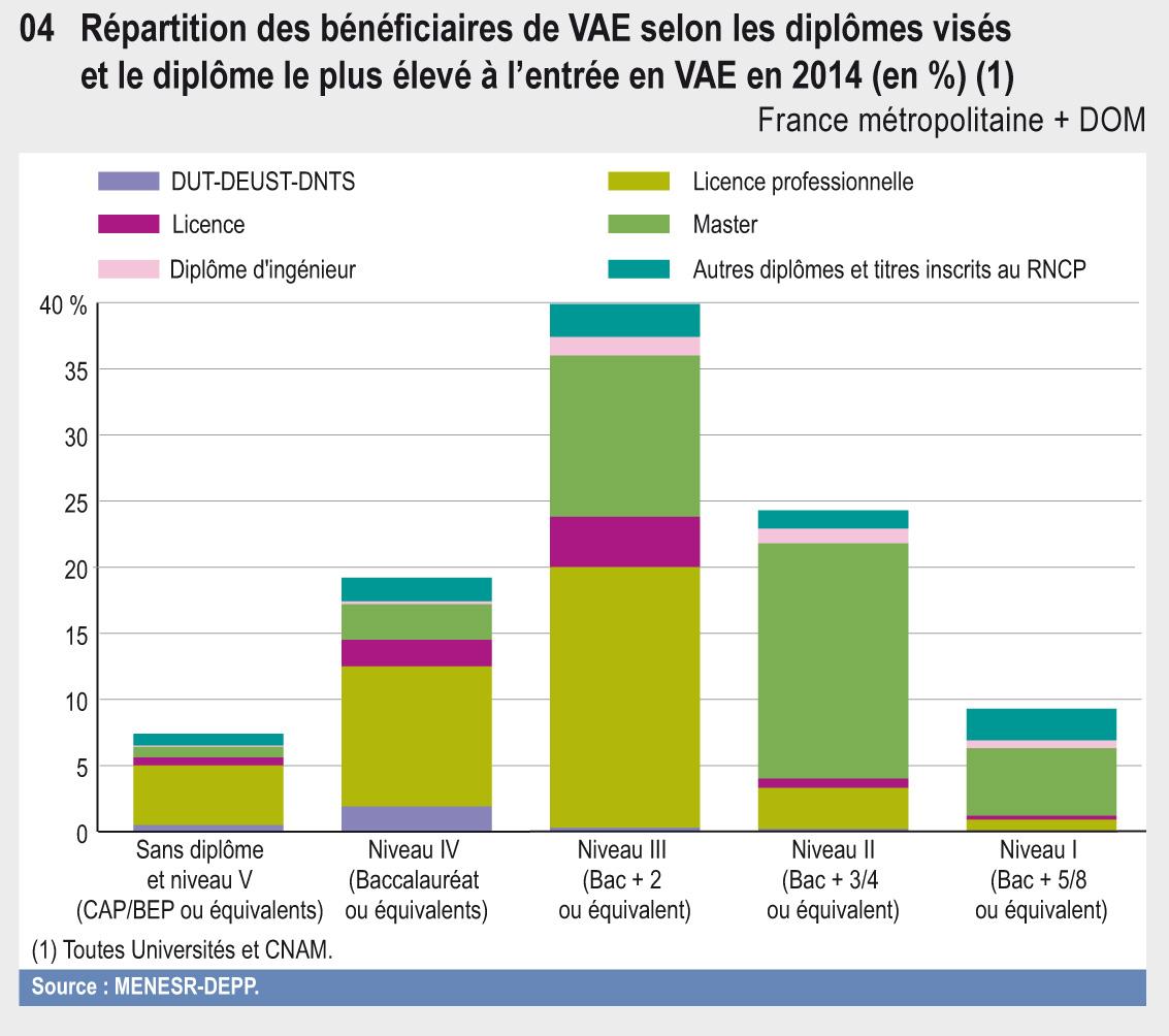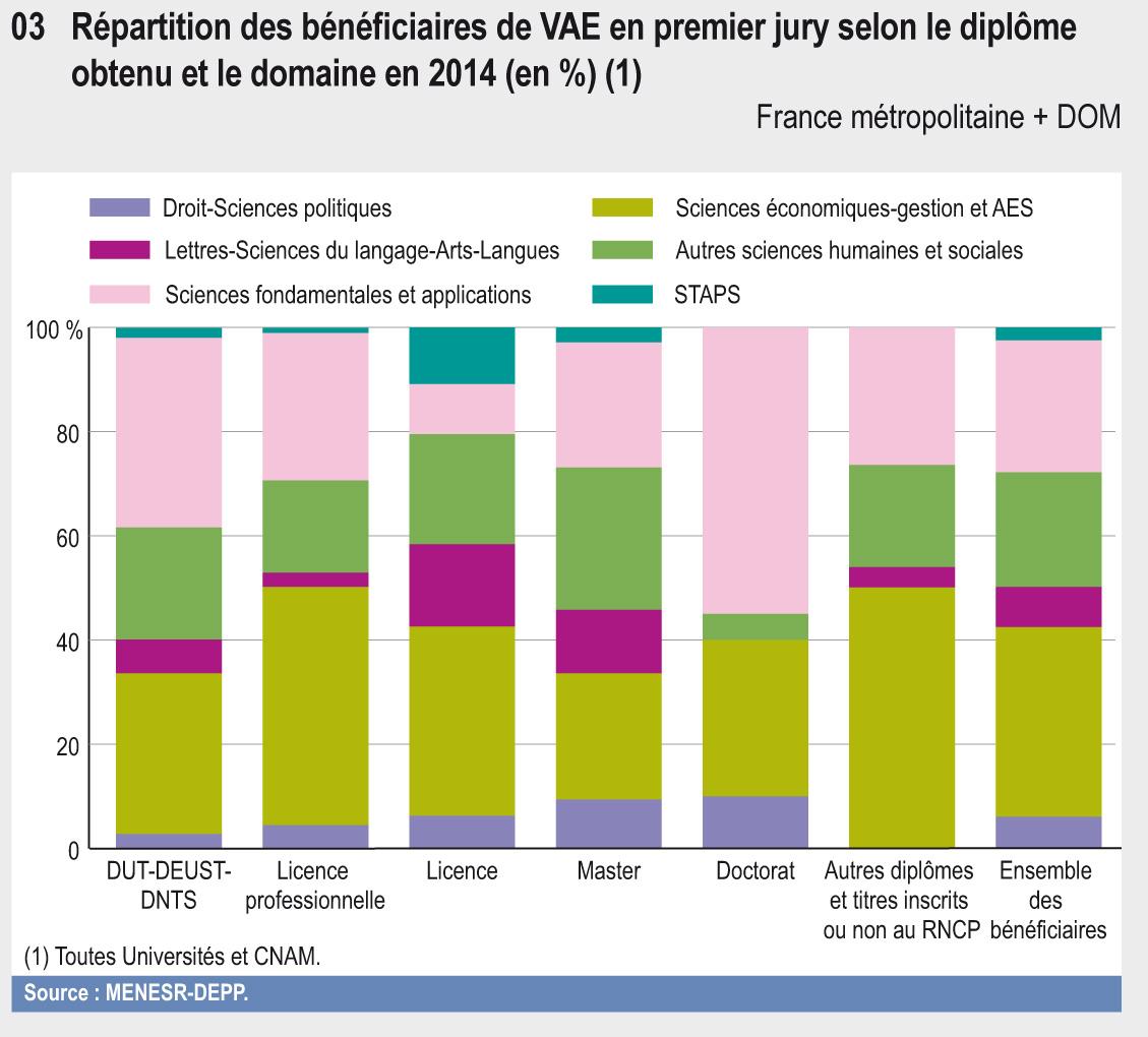 En 2014, sur les 4 267 bénéficiaires de VAE, 72 % ont été des VAE totales (61 % ont été obtenu en premier jury et 11 % en post-premier jury). Ces diplômes complets délivrés par la VAE représentent 3 % des diplômes délivrés en universités. Les 28 % des bénéficiaires de VAE restant ont obtenu une VAE partielle en premier jury.
