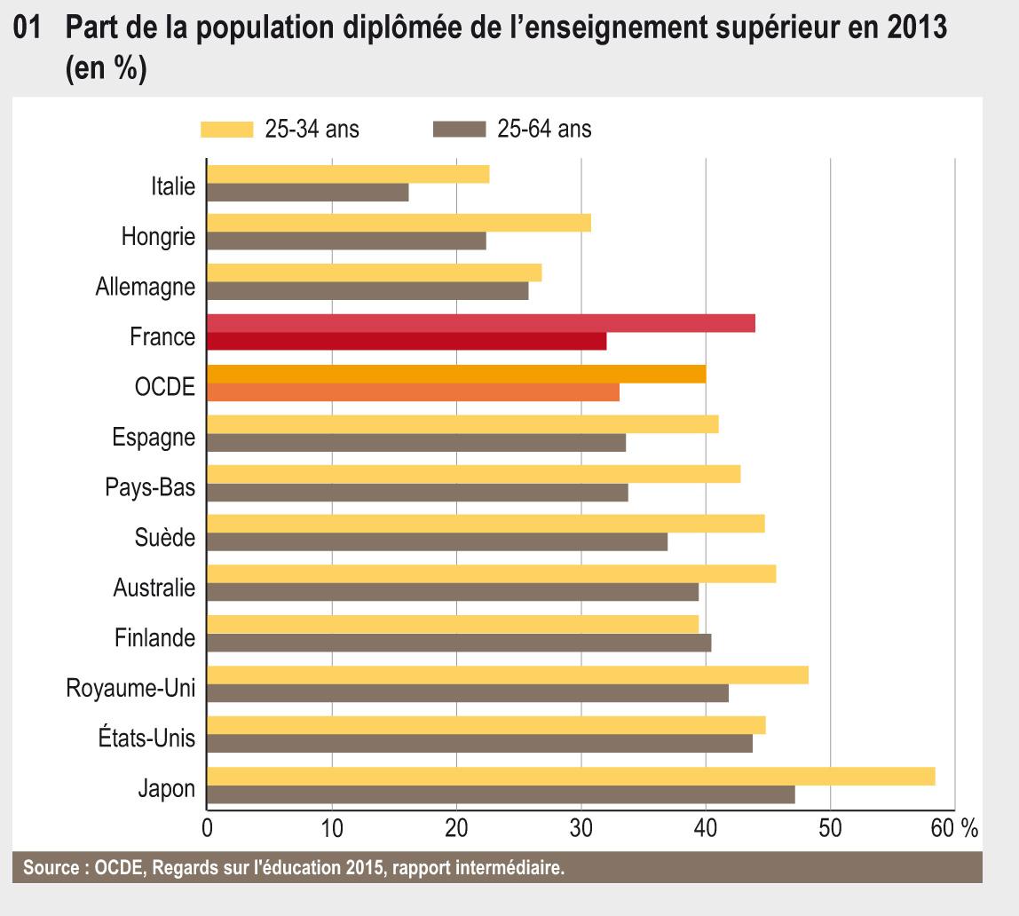 En France, les jeunes sont plus souvent diplômés de l'enseignement supérieur que les personnes plus âgées et plus souvent aussi que les jeunes vivant dans les autres pays de l'OCDE. Au début des années 2010, 44 % des jeunes sortants de formation initiale sont diplômés de l'enseignement supérieur.