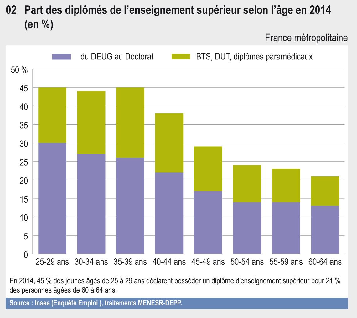 En 2014, 45 % des jeunes âgés de 25 à 29 ans déclarent posséder un diplôme d'enseignement supérieur pour 21 % des personnes âgées de 60 à 64 ans.