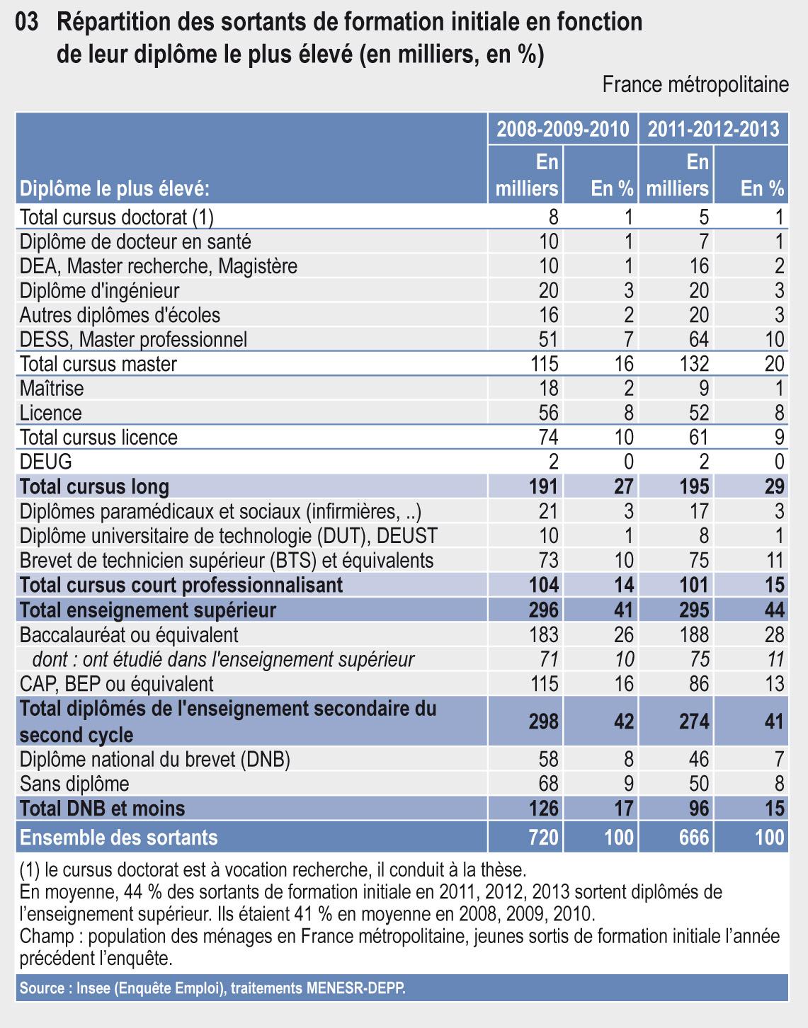 En moyenne, 44 % des sortants de formation initiale en 2010, 2011 ou 2012 sortent diplômés de l'enseignement supérieur. Ils étaient 41 % en moyenne en 2008, 2009 et 2010.