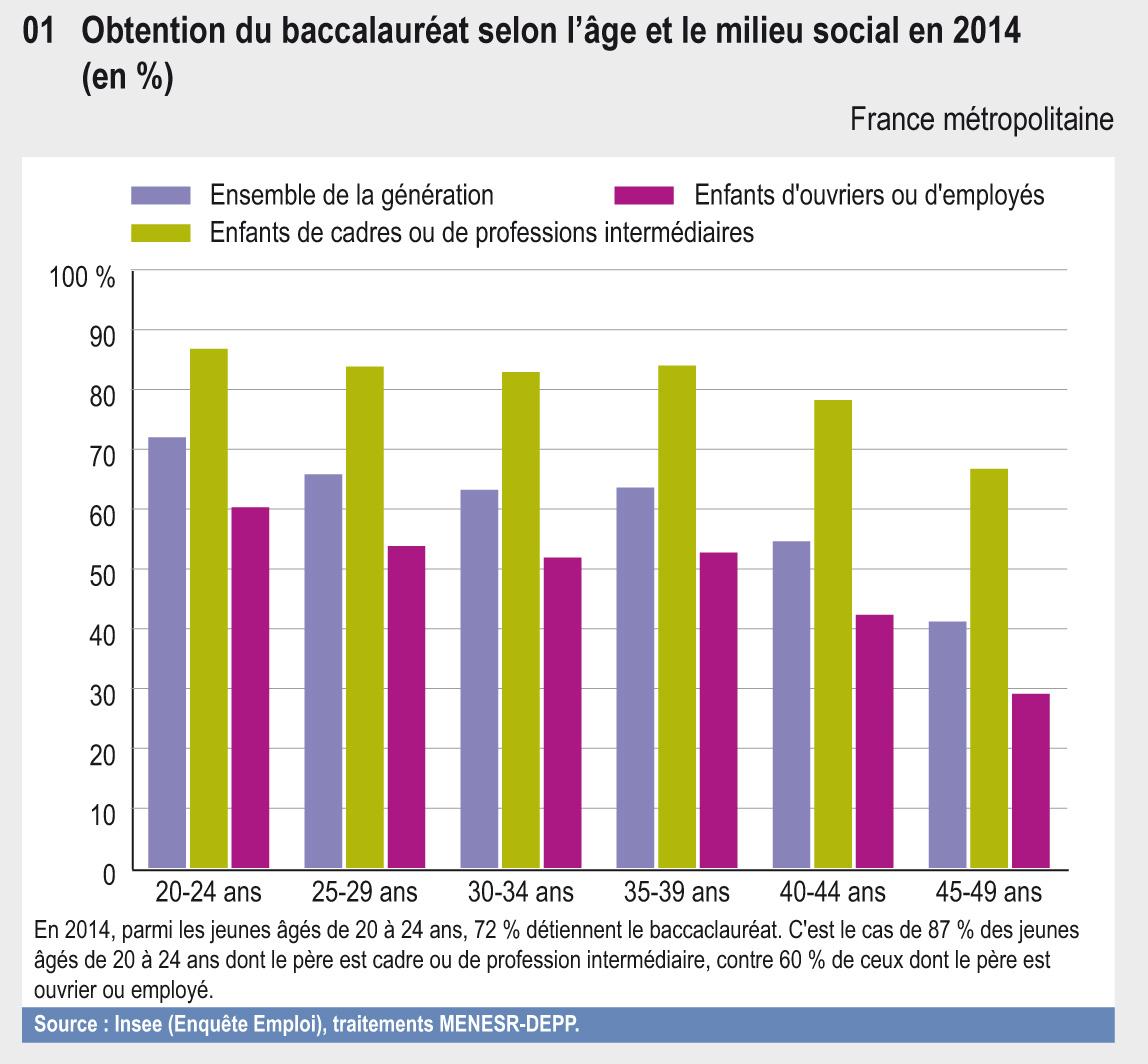 En 2014, parmi les jeunes âgés de 20 à 24 ans, 72 % détiennent le baccaclauréat. C'est le cas de 87 % des jeunes âgés de 20 à 24 ans dont le père est cadre ou de profession intermédiaire, contre 60 % de ceux dont le père est ouvrier ou employé.