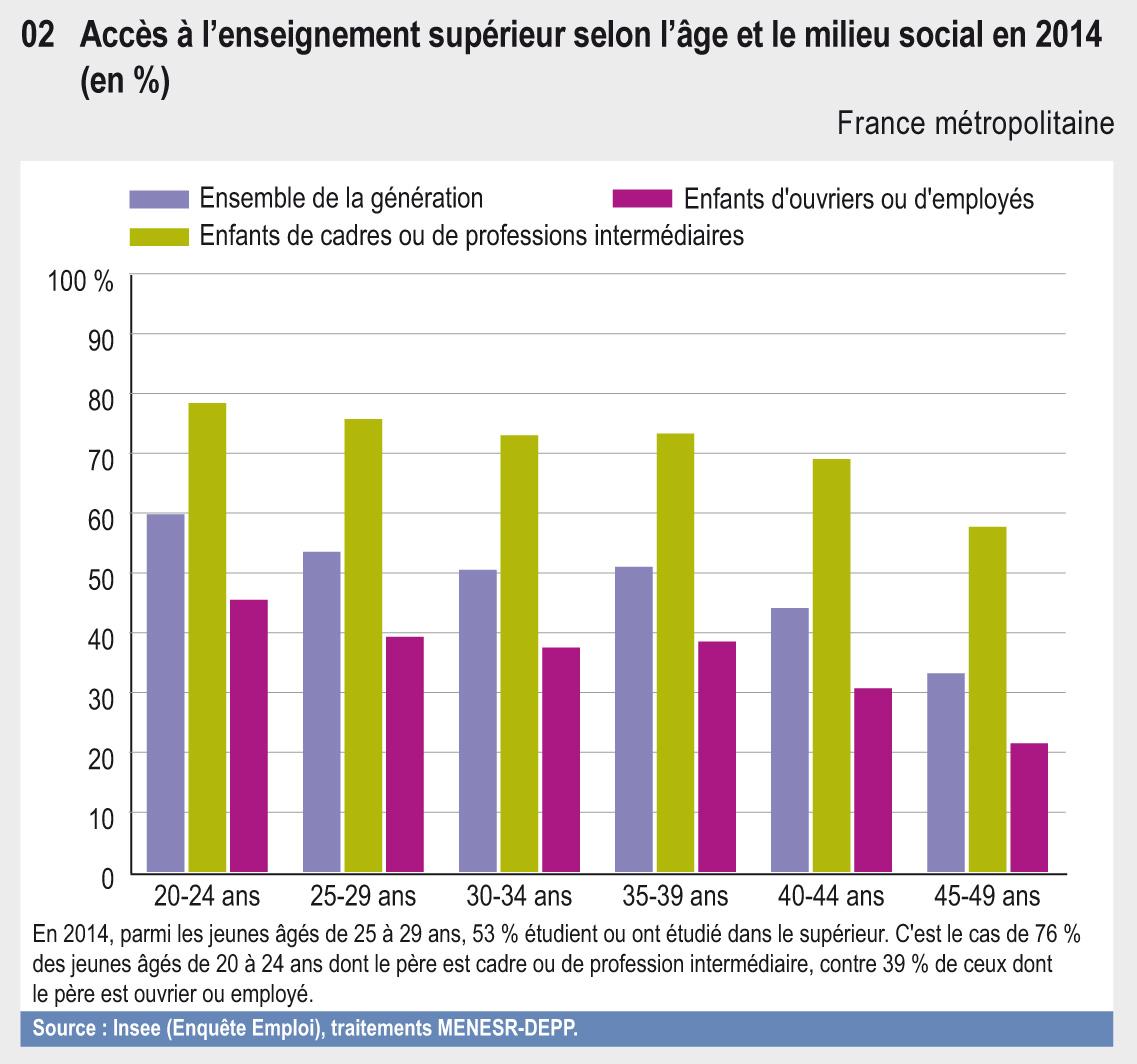 En 2014, parmi les jeunes âgés de 25 à 29 ans, 53 % étudient ou ont étudié dans le supérieur. C'est le cas de 76 % des jeunes âgés de 20 à 24 ans dont le père est cadre ou de profession intermédiaire, contre 39 % de ceux dont le père est ouvrier ou employé.
